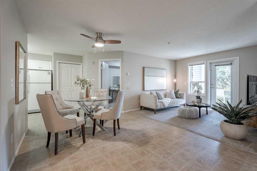 This lovely ground-level unit offers a perfect blend of comfort and convenience, backing onto a serene courtyard park. Upon entry, you'll be welcomed into an open space layout where the living room seamlessly connects to the dining area and a spacious kitchen with a large walk-in pantry/storage. The stackable washer/dryer is conveniently located in the kitchen. Both bedrooms overlook the green space, and your back patio enjoys privacy created by mature trees and lovely landscaping. The unit is completed with a huge bathroom and coat closet/storage. The building boasts numerous amenities for occupants aged 55 and over, including a library, café bistro, laundry facilities, hobby/social space, fitness room, foyer lounge area, and more. Additionally, it's situated close to shopping and offers easy access to Stoney Trail.