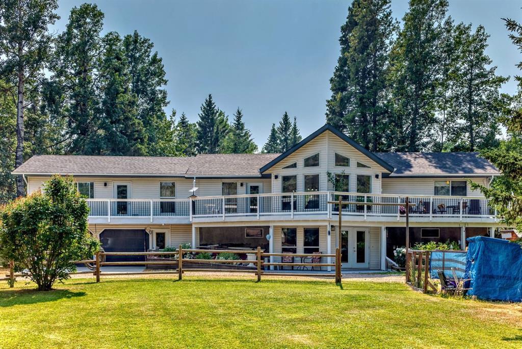 Discover the perfect blend of privacy and convenience with this charming 2+2 bedroom walkout bungalow. Situated on a private 2.15-acre lot, this home is a mere 15 minutes from Burnstick Lake, adjacent to Crown lease land, and close to numerous fishing lakes, rivers, and public lands to the west. The living room boasts vaulted ceilings and large windows that frame the beautiful, private, treed yard. The home is equipped with A/C for your comfort. The main floor features a seamless flow between the dining, kitchen, and living room areas, with easy access to both front and back patios. The back patio is complete with a natural gas hook-up for your BBQ. Enjoy a spacious master suite with a sitting area, a massive 4-piece ensuite with a jetted tub, a shower, complete in floor heating. You'll also find a custom walk-in closet that must be seen to be believed. The main floor also includes a second bedroom, a 4-piece main bath, and a convenient laundry room. The basement features in-floor heating, a large rec room, two additional bedrooms, a 4-piece bath, a large storage area, and a utility room. Sellers have added a 2-car garage with an office above, perfect for a home-based business or potential renovation into a separate living space (plumbing accessible from the garage underneath). Enjoy a large circular driveway, a huge garden, a firepit area for entertaining, and RV hookups in the center of the yard for friends and family. The interior of this home is wheelchair accessible with most doors being 36 in. width. The possibilities are endless! This property is perfect as a family home, a second recreational residence, a retirement retreat, or even a short-term rental.