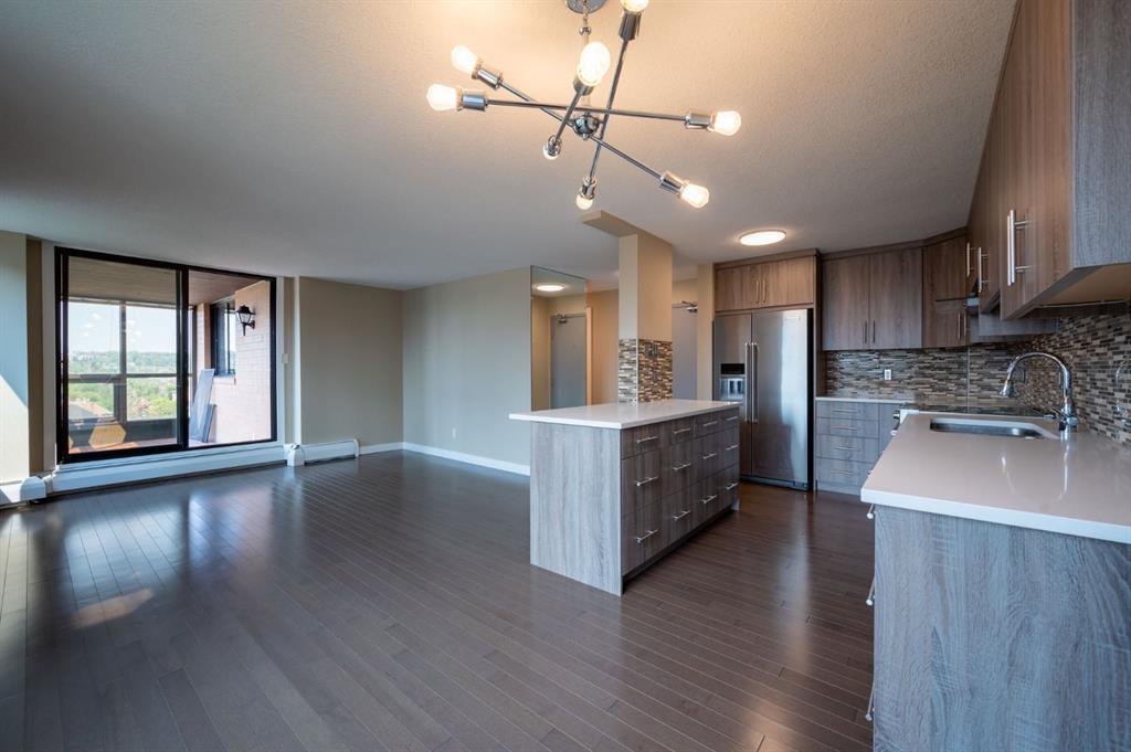 Previously owner-occupied and true pride of ownership! Welcome to this stunning 2-bedroom, 1-bathroom + sunroom apartment on the 6th floor of a meticulously maintained building. From the moment you enter The Huntsman, you'll be captivated by its modern and elegant lobby, featuring two elevators and access directly to the underground parkade! This corner unit boasts a beautiful & unobstructed SW facing panoramic view from the large windows, filling the space with abundant light. The open-concept design seamlessly connects the kitchen, dining, and living areas. Noticing the beautifully renovated kitchen and bathroom. As well as ample storage and in-suite laundry for your convenience! The primary bedroom features a large walk in closet with floor-to ceiling windows bringing in all that beautiful natural light. An additional 80-square-foot enclosed sunroom offers a versatile space perfect for entertaining or relaxing while enjoying the spectacular view! The Huntsman offers a range of amenities, including underground parking, a garbage chute, bike room, storage locker, fitness centre, sauna, second-floor rooftop patio, gardens, and a pickleball/tennis court. Situated within a 5-block radius of the C-Train, 17th Ave, grocery store, and Bow River walking paths, this location is perfect for embracing city life. Don't miss this incredible opportunity to make this beautiful apartment your new home.