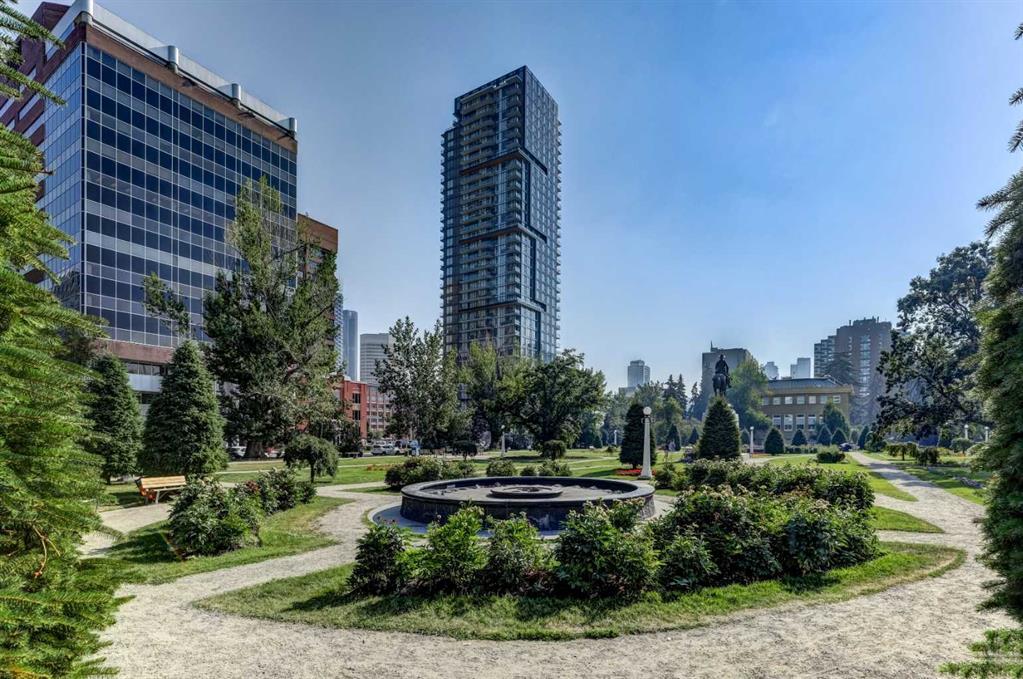 Amazing park, city and mountain views from every window of this extremely well kept, modern condo located on the 11th floor of the prestigious Park Point building. Modern finishes throughout this one bedroom plus den condo including high quality laminate flooring, neutral paint, granite and marble countertops, lighting, and appliance package. The well laid out kitchen is equipped with stunning granite countertops and matching granite slab backsplash, European appliances including Liebherr panelled fridge/freezer, AEG gas cooktop and wall oven, under-cabinet lighting and open shelving with lights. The living room with access to the balcony is large enough for a couch and a small dining table with chairs. Primary bedroom with walk-in closet and access to the den area that is perfect for an at-home office. The stunning bathroom with fully tiled shower, vanity with marble countertop, and hidden storage behind the mirror is sure to impress. "Italian Armony Cucine" brand kitchen and bathroom cabinets with soft-close/impact resistant doors and drawers. In-suite laundry with additional space in the closet for shelving. The views from the spacious SW facing balcony are a highlight of this condo. Enjoy looking out at the unobstructed views of Central Memorial Park, the city, and the mountains. Central A/C, titled underground parking and an assigned storage locker are included with this condo. Park Point is a great place to call home, offering a fitness centre, owner's lounge with kitchen, entertaining space and outdoor patio, pet & car wash, bike storage, guest suite, visitor parking, and concierge. Very walkable location with great access to parks, restaurants, the downtown core, 17 Avenue, Stampede Park, and just 4 blocks from Safeway!