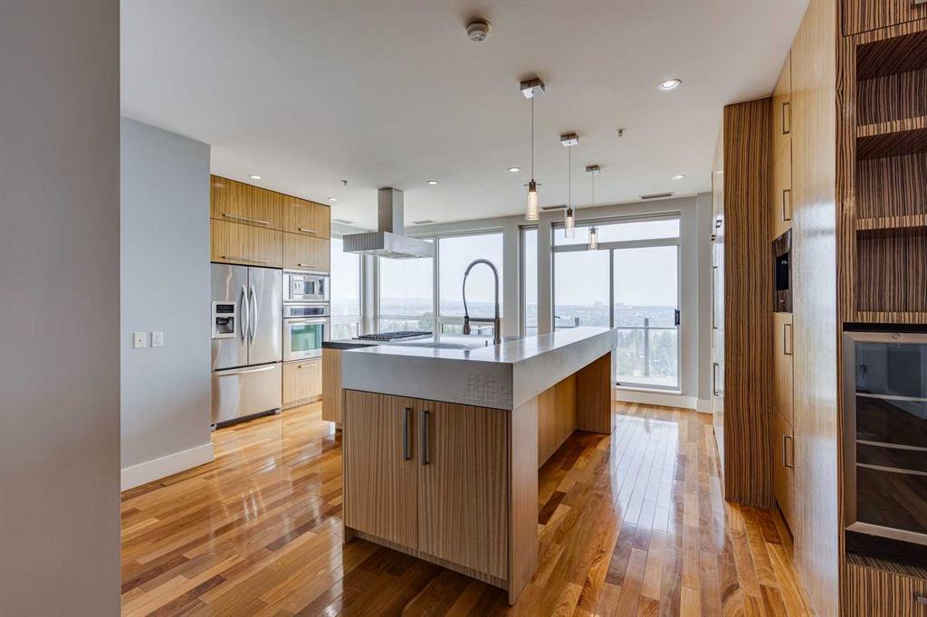 Welcome to the Casel! This corner offers one of the most unique and customized floor plans in the building, setting a new standard for penthouse living. With breathtaking city and river valley views, this 2-bedroom residence is perfect for those who love to entertain. The gourmet kitchen is a chef's dream, featuring custom cabinetry with an abundance of built-in storage, including swivel pull-out racks. Brazilian walnut hardwood floors throughout and numerous high-end finishes. The kitchen also boasts stainless steel appliance package, plus hidden storage space including swivel pull-out racking. The spacious primary bedroom includes custom built-ins and a fabulous ensuite bathroom. The second bedroom/den is versatile, equipped with a built-in Murphy bed and a mounted desk, making it ideal for guests or a home office. Convenience is at your doorstep with Cassis bistro, a wine boutique and barber all located on the building’s main floor. Additionally, you’ll enjoy the comfort of a heated underground parking stall. This exceptional apartment truly stands out. Dare to compare!