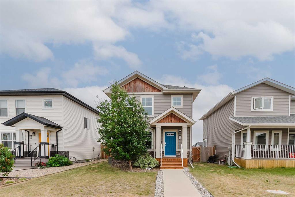 This 2-story home offers both charm and practicality. Starting with air conditioning to keep you comfortable during Summer's heatwaves. With 3 bedrooms upstairs, 2.5 bathrooms, modern finishes, fully fenced yard, & central vac, this property has plenty to give at an affordable price! Plus, it's just a three minute walk to the scenic Trans-Canada Trail; perfect for those with 4-legged friends or who just love connecting with nature. The main floor flows seamlessly from the living room to the kitchen, which features dark cabinetry accented by gold hardware, an island with seating, stainless steel appliances, and a spacious dining area. A convenient 2 piece bath and closet are located near the back entrance. Upstairs, the primary bedroom includes a 3 piece ensuite, while two additional bedrooms share a 4 piece bathroom. The South facing backyard features a 2 level deck, dog run, firepit area, and garden boxes! There is room to build a garage, where there is currently a graveled parking pad. The unfinished basement offers plenty of potential, with laundry, a rough-in for an additional bathroom, under stair storage, utility room, and a large family room. This property has been meticulously maintained, making it move-in ready. Located in Blackfalds, a town known for its strong sense of community, where both small town charm and modern amenities exist.
