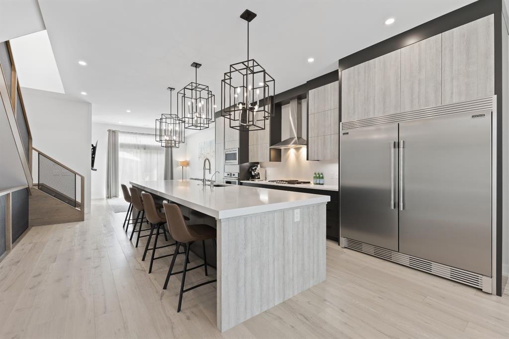 OPEN HOUSE: SATURDAY JULY 27 2-4PM. Nestled in a peaceful cul-de-sac, this semi-detached home exudes quality and thoughtful design, offering the epitome of modern living. Experience luxury with custom kitchens featuring built-in appliances and a stunning 14-foot quartz island. Wide plank white oak hardwood floors and European tile complement the 10-foot ceilings, while custom built-in cabinetry adorns every floor. The main floor impresses with its open-concept kitchen, living, and dining areas. Cozy up by the fireplace in the living room, which opens to a large deck through sliding doors. A modern designer staircase leads to the upper level, where you’ll find a spacious master suite complete with a luxurious bathroom featuring heated floors, dual sinks, a steam shower, and a walk-in closet. Two additional bedrooms, a main bath, and a laundry area complete this level, with large hallways and an open stairway filling the space with light. The lower level offers a full recreation room with a bar, wine cellar, bedroom, and full bath with heated floors. Enjoy the privacy of a large, sunny south-facing yard with a huge deck, perfect for outdoor gatherings. A double detached garage and fully landscaped grounds complete this exquisite property. Located just steps away from Marda Loop and a short commute to the downtown core, this home provides both convenience and luxury for a truly exceptional living experience.