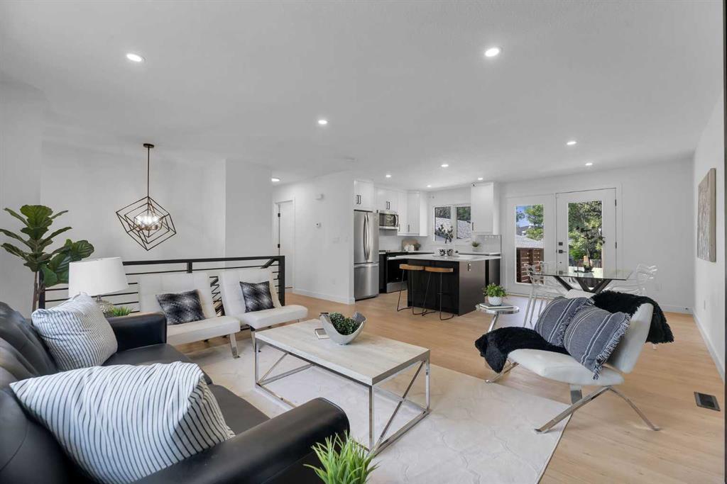 BASEMENT SUITE (ILLEGAL) W/ DEDICATED SEPARATE ENTRANCE | BRAND NEW OVERSIZED DOUBLE GARAGE | EXTENSIVELY RENOVATED | LARGE LOT | WEST-FACING BACKYARD | Welcome to this extensively renovated 5-bedroom, 3-bathroom bi-level home in the well-established community of Pineridge. This home exudes contemporary design and boasts a refreshing, move-in-ready appeal. As you step inside, you're greeted by a spacious living room with a stunning contrasting fireplace accent wall, perfect for cozy evenings with family and friends. The open concept layout seamlessly connects the living room to a modern kitchen, where you can whip up culinary delights using stainless steel appliances, a gorgeous island, and stylish contrasting cabinetry. Picture yourself enjoying meals in the bright dining area, filled with natural light streaming through the west-facing windows. Upstairs, three generously sized bedrooms offer comfort and privacy, with the primary bedroom featuring its own ensuite bathroom. A second full bathroom and a dedicated laundry space add to the convenience. Downstairs, envision the possibilities with an illegal suite, complete with its own separate side entrance. This space is ideal for extended family or potential rental income (abiding by the City of Calgary regulations). It boasts a well-appointed kitchen, two bedrooms, a full bathroom, a large laundry space, and a spacious living room. The home's exterior is a modern black and white, making a striking impression. Outside, the large south-facing backyard invites you to relax and soak up the sun or host summer barbecues. The newly developed oversized double car garage provides ample space for vehicles and storage, perfect for all your needs. Living in this high-amenity neighborhood of Pineridge means you're just minutes away from public transit, Peter Lougheed Hospital, Village Square Leisure Centre, and various shopping plazas. This beautifully renovated home offers the perfect blend of modern design and practical living spaces, ready for you to move in and make it your own. Schedule your private showing today and start imagining your life in this exceptional home.