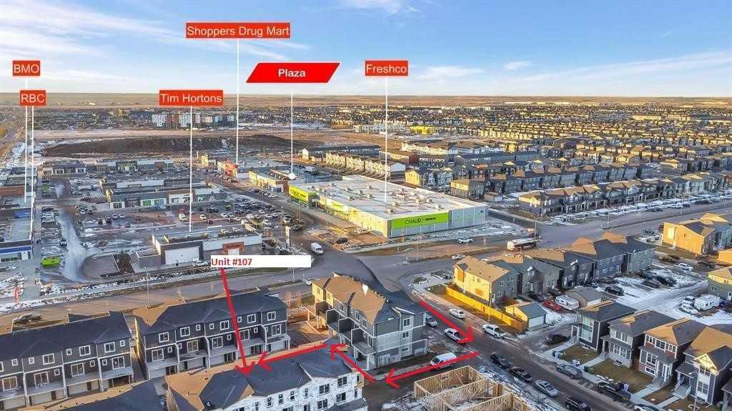 PRICED TO SELL** Motivated Seller **** LOCATION ......LOCATION ......LOCATION........ LOCATION! Brand new and never lived in townhouse with steps away from major amenities waiting for you. A dream home in the heart of the Cornerstone. NEXT TO TIM HORTANS, FRESHCO, SHOPPERS DRUG MART, BMO, POPEYES AND MANY MORE. 2 minutes TO STONEY TRAIL AND 10 MINUTES DRIVE TO CALGARY AIRPORT. As you enter the main door you're welcomed with a bright and spacious foyer that sets a warm tone. The double garage on the right offers not only a place for your vehicles but also ample storage space. As you step inside, you'll be greeted by an inviting open floor plan on the upper level, illuminated by natural light streaming through large windows. The expansive living room provides the perfect setting for relaxation and entertainment, while the modern kitchen, equipped with sleek stainless steel appliances, is a chef's delight. Step through the patio door adjacent to the kitchen and onto the balcony, where you can enjoy summer evening barbeques and soak in the vibrant atmosphere.On the second level, you'll find a convenient laundry room and two additional bedrooms, perfect for accommodating guests or family members. A well-appointed bathroom serves these bedrooms, ensuring comfort and privacy for all occupants. The luxurious primary bedroom boasts a spacious walk-in closet and a pristine 4-piece ensuite bathroom, complete with a walk-in shower, offering a serene retreat at the end of each day.With its unbeatable location and immaculate condition, this property is a rare find in today's market. Don't miss out on the opportunity to make it yours – schedule a showing with your favorite realtor today before it's gone!