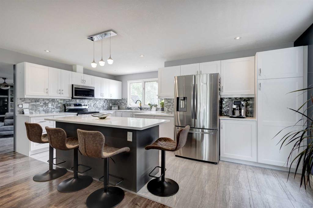 Welcome to the family-friendly community of Woodbine! This home features 4 bedrooms above grade (one is on the main floor), 2.5 bathrooms, a double attached garage, and an amazing backyard that exits onto a green space leading to Woodbine Elementary. Entering the front door you are welcomed into a bright, open concept space that has been lovingly updated with modern styling, colours and finishings. The foyer has plenty of room to greet guests, gleaming tile, and a generously sized closet for tucking away all that outdoor gear. The open concept living, kitchen and dining areas boast neutral wide-plank LVP, updated pot lighting and tons of natural light (especially from the recently replaced front bay window!). The kitchen is a dream for the at-home chef or entertainer with plenty of cupboard/storage space, quartz countertops, glass tile backsplash, stainless appliances, and a window at the sink that overlooks the beautiful backyard. Adjacent to the kitchen is a fantastic family room with a cozy wood burning fireplace backdropped by beautiful tile and built-ins on either side. This level also offers a fourth bedroom, 2 piece bathroom and laundry area. Ascending to the AIR CONDITIONED second level the primary bedroom is privately situated at the south side of the home and has a view of the green space; this retreat also offers a walk-in closet and a newly renovated 3 piece ensuite inclusive of new shower, quartz vanity top with undermount sink, updated fixtures/lighting and plenty of storage. The second level is completed with an updated four-piece main bathroom with soaker tub and two more bedrooms. The best part of this home is the south facing backyard; with a brand new 12' x 24' deck and no neighbours behind it's truly the perfect place to unwind. This oasis has been thoughtfully landscaped, a gazebo with mesh and privacy screens included, tons of space for the kids to play and offers all day sunshine for optimal gardening conditions. The basement is prepped for a rec room and wet bar (all inspections are done and approved, just needs to be closed up). The basement is completed with a utility area and huge storage space. Bonuses: Roughed in for central vac. Roof 2016. Hot water tank 2012. New garage door and wi-fi opener. Most main floor windows replaced. 2 sides of backyard fence recently replaced.