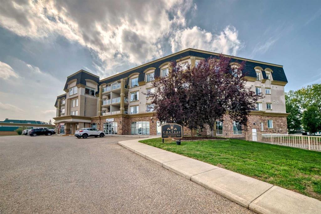 WELCOME to this wonderful condo located in the community of Lacombe! This top floor unit has an open floor plan with plenty of large windows which bring in an abundance of natural sunlight! The kitchen has plenty of wood cabinets for storage, kitchen island with electricity and drawers, and all appliances are included. Good sized dining room which is open to the very large, spacious living room area with a corner gas fireplace, ideal for those cooler days. There is a door off the dining room which leads out to the east facing balcony where you can sit and enjoy a morning coffee, or the evenings. The primary bedroom is a good size, has a walk-through closet which leads into a 3 piece ensuite with a seperate shower. There is a good sized laundry room which includes the washer and dryer, and an additional 4 piece bathroom. This unit includes 1 assigned underground, heated parking stall, and 1 assigned storage cage located in the parkade. The Chateau of Lacombe is a 55+ building, spouses under 55 can live here when they live with their 55+ spouse. Pets must be approved by the Board of Directors and are limited to 1 cat, fish or bird. There are no dogs outside of registered Service Animals. This building offers low maintenance living for those who want to relax and enjoy the simple life. There is an entertainment room for residence to utilize and gather for social events. The City of Lacombe is vibrant, fast-growing community which honors its architectural and historical heritage.