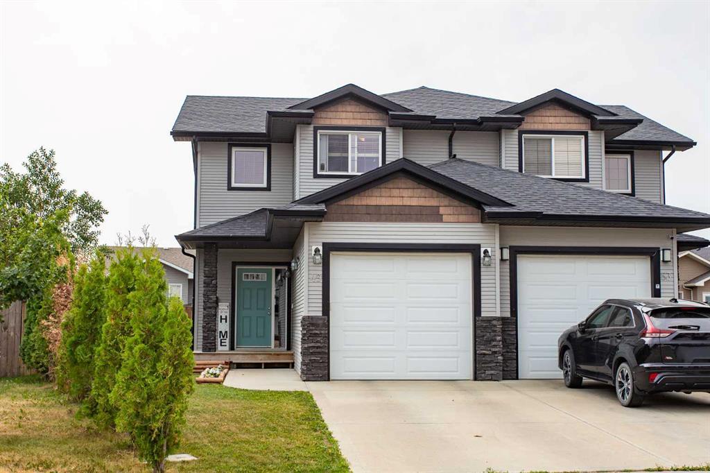 Welcome to this charming 2-storey duplex in the growing town of Blackfalds. Step into the inviting living room, complete with cozy carpet flooring, bright windows, and stylish larger profile baseboards. The kitchen features white cabinets, black appliances, and a wrap-around counter, perfect for meal prep and entertaining. On the main floor, you'll find a convenient 2-piece bathroom. Upstairs, the primary bedroom offers a walk-in closet and the same elegant baseboards found in the living room. The other two bedrooms are spacious, with standard closets and slab doors. A 4-piece bathroom with a white tub surround completes the upper level. The unfinished basement holds potential for customization and includes a high-efficient furnace, hot water tank, central vacuum system, and rough-in for a bathroom. The backyard is ideal for family gatherings, featuring a wood deck, wood fence, and landscaping, all set on a slightly larger corner lot. Located in a kid-friendly neighbourhood, this home is perfect for families. Come and see all that this fantastic property has to offer!