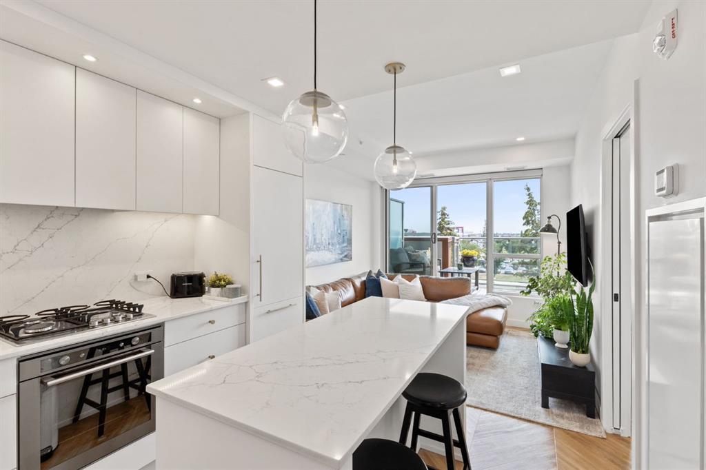 This condo has a beautiful design aesthetic. Its high-end finishes include 9ft ceilings, floor to ceiling windows, chevron luxury wide plank flooring, brushed gold hardware and quartz countertops in the streamlined modern kitchen, elegant bathroom and functional office nook. Additionally it has LED square pot lights, high end stainless steel appliances, including a gas range, a panelled fridge and dishwasher. The soft-close drawers, full-height backsplash, custom closets/cabinets, designer window coverings and modern light fixtures add beauty and ease. It also boasts a Large* (200 sq ft) covered SW facing patio that offers mountain views, with full exposure sunrise to sundown.