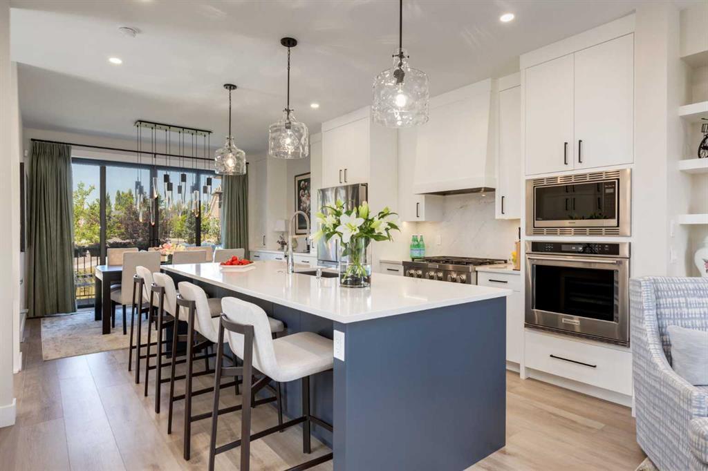 Welcome to this exceptional townhouse in the fabulous new community of Griffith Pointe. A bright and modern three-storey town home with over 1700 square feet of living space. The stylish brick facade sets a sophisticated tone, while the farmhouse style of the development is young and modern. The main level features wide plank luxury vinyl flooring, high ceilings, and an open floorplan that allows natural light to fill the space from three separate elevations. The versatile office located on the main floor, could also serve as an additional bedroom or gigantic mudroom, and opens to your walkout level backyard. The heart of the home is the designer modern Chef’s kitchen with a stunning quartz-topped island featuring navy blue "nautical" colored cabinetry, complemented by high end stainless steel appliances including a six-burner gas cooktop, four door Samsung refrigerator/freezer, built-in convection oven, and beverage fridge. A custom dining area with a built-in servery and an “icicle” crystal chandelier leads to a second-level “outdoor living room” overlooking lush green space. There is a gas line on the deck for a BBQ or heater. The living room is anchored by a striking floor-to-ceiling fireplace with floating shelves, tweed gray tile and unique rattan styled cabinetry. On the third level, the primary suite features a vaulted ceiling, a spacious walk-in closet, and a luxurious ensuite with a freestanding soaker tub, double quartz vanity in a fresh seafoam color, a frameless glass shower with multiple showerheads, and heated floors. The second bedroom on this level is nearly as grand, with its own vaulted ceiling, walk-in closet, and ensuite bathroom with heated flooring. This home seamlessly combines style, comfort, and functionality, making it a true standout. Additional features include a heated garage with parking for a second vehicle on the driveway, Hunter Douglas blinds, exquisite porcelain tilework, spectacular light fixtures, high ceilings with 8' solid core doors, hot water on demand, an HRV system and incredible designer finishings. The cherry on top, this superb home is located in Discovery Ridge and provides quick access to Calgary’s top private schools, an abundance of amenities in Aspen Landing, Westhill Shopping Centre and more. Take family strolls through the extensive neighborhood walkways and along the Elbow River or go enjoy the many built in recreation facilities Discovery Ridge has to offer including the river pathway system, soccer fields, squash and racquet courts. Note: There is an annual Discovery Ridge HOA fee of $315 and the monthly condo fee of $274.88 covers snow removal, all landscaping and window washing twice yearly.