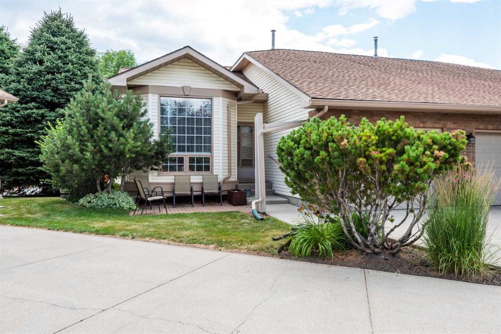 This beautiful villa style bungalow is located in the heart of Douglasdale. This is an adult community (18+) in Douglasdale Village on the Green. Many upgrades with upgraded lighting and freshly painted. You will love the open vaulted ceilings throughout the main level with hardwood floors in the living room, dining room, and hallway and a corner gas fireplace in the living room. A beautiful white and bright kitchen features quartz countertops and a glass tile backsplash, plus an upgraded sink and faucet. The cheerful breakfast nook is flooded in natural light with a huge front window and a side window besides. A large primary bedroom has room for a king size bedroom suite and the blinds are top down/bottom up in the bay window for privacy as you wish. Enjoy a walk-in closet and a four piece ensuite bathroom with tile floors, a low profile bathtub and a separate shower, with an upgraded quartz vanity top and new sink vessel. The main floor laundry is shared with a 2 piece powder room next to the garage. There is a nice south facing deck surrounded by trees and shrubs and a relaxing open setting overlooking the school fields. The fully finished basement has a spacious family room, two good size bedrooms, and a 3 piece bathroom. (One bedroom window is less than legal egress). There is a barn door between the family room and one bedroom, so this can also serve as a flex space depending on your needs. Plenty of storage with many large closets. All the poly B piping was replaced and some windows have been replaced. This well managed complex has affordable fees and includes common area maintenance, landscaping and snow removal, insurance, professional management and reserve fund contributions. The golf course meanders along the north side of the complex in this stunning golf course community of the Eaglequest-Douglasdale Golf Course. Close to local shops, restaurants, gas and regional shopping with easy access to Deerfoot Trail and the Stoney Ring Road in all directions.