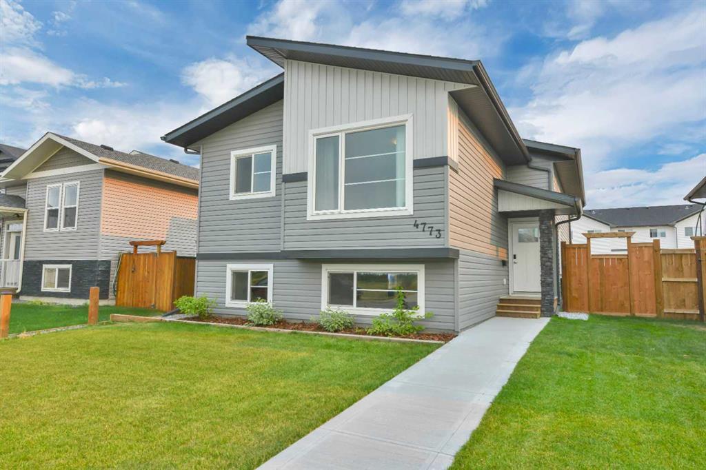 Situated in the beautiful Aspen Lakes area of Blackfalds, fresh, new and lots of young families. Quality built home only 3 years old....still even smells new. 3 bedrooms and 2 full bathrooms! Elegant tiled entry, maple railing with metal spindles to the main level. OPEN CONCEPT Living/Dining/Kitchen area with vinyl plank flooring and eye-catching TRAY CEILING in the Living Room. White maple kitchen cabinetry, center island with dark mocha stained cabinetry, pantry and all stainless steel appliances included. Kitchen overlooks the Living room with an adjacent spacious dining area and garden door out to the deck over looking the backyard. Master has a walk-in closet and 4 pce ensuite. Other quality features are Low E coated argon filled windows, closets with actual swinging doors, engineered floor system, high efficiency furnace, roughed in vac and roughed in basement infloor heat. Basement is open for your personal development with lots of room for 2 additional bedrooms, a bathroom and family room. This is an absolutely beautiful home that will be a pleasure to show.