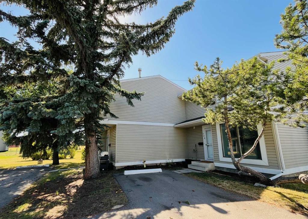 Comfort // Affordability // Convenience // Functionality // Quick Possession!! Welcome to this charming 2-bedroom + den townhouse located in the heart of Pineridge with great curb appeal! Upstairs, you'll find 2 large bedrooms and 1 full bath. Brand new carpet throughout! Enjoy good views from both bedroom windows. The main floor features an open plan with a large kitchen, dining area, living room, and a 2-piece bath, all with plenty of natural light. The fully finished basement includes a large family room, a den/office, another full bath, and a small kitchenette with a fridge and sink. Brand new furnace // Brand new hot water tank // 2-year-old laundry! Stepping out the back door, the home backs onto a large green space with no rear neighbors. Out front, there is a conveniently located assigned parking stall, with additional stalls potentially available for rent. Close to all amenities, schools, parks, shopping, and the Village Square Leisure Centre... Great value!