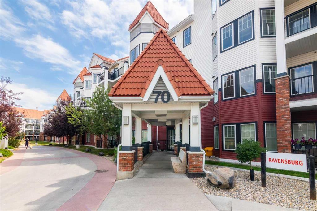 Experience modern urban living in the heart of Calgary's sought-after NW community, Royal Oak. This stunning 3rd floor corner unit in the Ravensburg building is directly across from the residents' clubhouse. The upgraded 1-bedroom, 1-bathroom unit features an open-concept layout that seamlessly integrates the dining area with the living room. Large bay windows flood the space with natural light and offer picturesque views of the interior courtyard and amenity building. Step out onto the balcony to enjoy the serene courtyard views. The contemporary kitchen is a chef's delight, with ample cabinetry, granite countertops, pot drawers, and under-cabinet lighting. It's equipped with stainless steel appliances, including a built-in wall oven, cooktop, microwave/hood fan, and dishwasher. Additional features include in-suite laundry, titled underground heated parking conveniently located near the elevator, and a spacious titled storage locker. The complex offers fantastic amenities, including a private clubhouse with a well-equipped gym, an owner's lounge with a pool table, darts, a big-screen TV, a kitchen for hosting private functions, and access to a huge walkout deck — all wheelchair accessible.