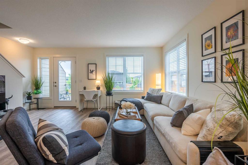 Here is your opportunity to own a stunning, bright CORNER UNIT townhome nestled in RIVERSTONE, Cranston. 3 Bedroom, 2.5 bathroom, Sienna Model with upgrades throughout. Modern light fixtures, quartz countertops, and stainless steel appliances are just a few of the many upgraded features of this home. The well appointed kitchen includes pot and pan drawers, pantry cupboard, and large island with seating for 5. Spacious dining room and living room is perfect for entertaining with SW facing deck that includes a Gas BBQ hookup. Upgraded Luxury Plank Flooring on lower and main levels as well as stairs leading up to main level for easy cleaning. Primary bedroom has large bright windows, beautiful ensuite with walk in shower and spacious walk in closet. 2 additional bedrooms and a 4 piece bathroom round out this level. Ground level has an extra developed flex area for office, work out area or extra living space - the choice is yours. Double attached garage for cold winters and central air-conditioning for hot summers are in place. Sit back and relax while someone else shovels the snow, mows the lawn and cleans the windows in this ZERO EXTERIOR MAINTENANCE development! The community of Riverstone offers picturesque pathways, green spaces, playgrounds and the Bow River steps away. Residents of Riverstone are part of the Cranston Residential Association and have access to the community hall, outdoor rink, tennis/pickleball courts, basketball courts and splash park. Easy access to shopping, Seton hospital, YMCA, movie theatre, Deerfoot Trail and Stony Trail. This home is move in ready!