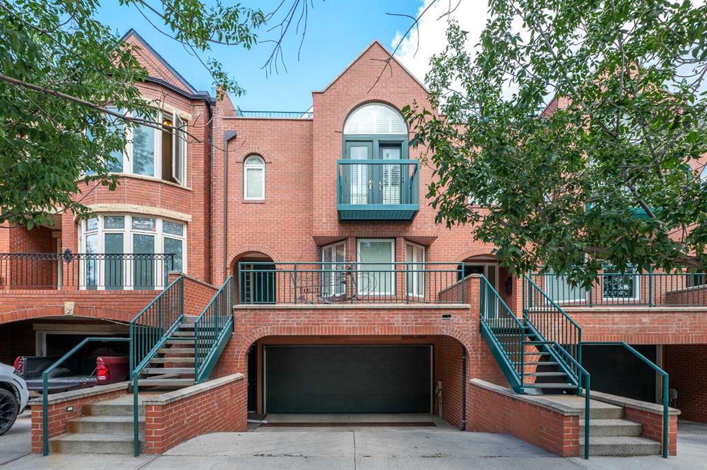 Stylish 2 bedroom Brownstone style townhome with 2 rooftop patios & gorgeous views in Lower Mount Royal offering over 3200 sq ft of developed living space! The spacious main level presents beautifully finished hardwood floors & high ceilings, showcasing the front formal dining room with ample space to hold a large family gathering or dinner party. Just steps away, is the gorgeous renovated Denca kitchen that’s tastefully finished with plenty of counter/storage space, island/eating bar walk-thru butler’s pantry to the dining room & high-end appliances. The living room with main floor patio access & feature fireplace is open to the kitchen. A 2 piece powder room completes the main level. The second level hosts 2 bedrooms, a 4 piece bath with in-floor heat & laundry room with sink & storage. The primary bedroom with vaulted ceiling & private balcony also boasts a walk-in closet & private 5 piece ensuite with in-floor heat, dual sinks, a relaxing freestanding soaker tub & separate shower. The third level loft area is perfect for a home office space or studio & also has access to the north & south facing rooftop patios with lovely views! Basement development includes a family/media room with wet bar & mudroom with access to the double attached garage. Other notable features include central air conditioning, newer hardwood on the staircase, built-in speakers, triple pane windows, sand filled cinder block common walls that provide excellent sound proofing, roof replacement (2017) with foam insulation & a fenced in back patio area – perfect for outdoor entertaining. Also enjoy the central location, walking distance to 17th Avenue & close to parks, schools, shopping & public transportation.