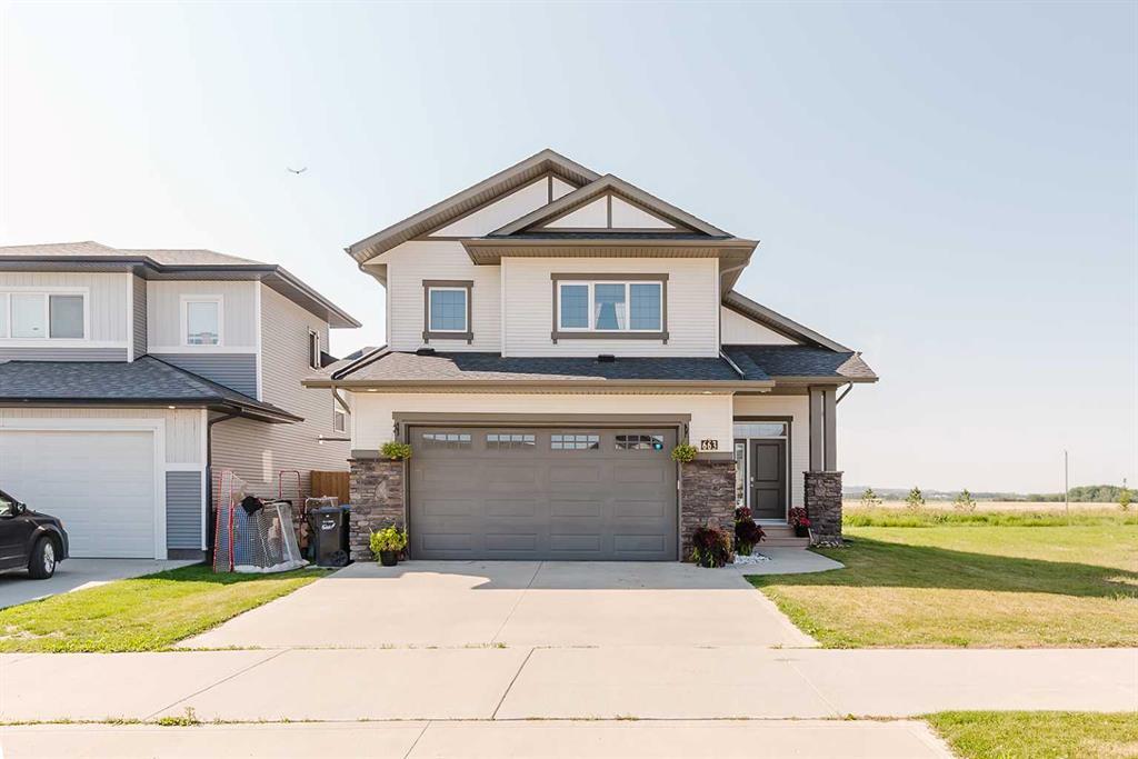 Imagine coming home everyday to unobstructed views of the prairies, complete with a pond and grasslands! It is truly a peaceful place to bird/animal watch, admire the sunsets, and watch the storms roll in. This property is a "home run". 5 bedrooms, granite counters, large tiled entrance, two-tiered deck with pergola, A/C, gas stove, 9' ceilings, in-floor heat in the basement; to name a few reasons! Being a modified bi-level means you have your own retreat for the primary bedroom, that fits a king sized bed, has a walk-closet, and 3PC ensuite w/ window. The living room basks in a ton of natural light, has durable laminate flooring and opens up to the dining area. From there, the kitchen is upgraded with stone backsplash, granite countertops, travertine tile floors, pantry, stainless steel appliances (gas stove to boot), & an eat up bar. The double doors off the dining area take you to the South facing yard, where you are sure to appreciate the natural gas line on the deck for BBQing, lower deck with pergola to take the heat off on those really hot Summer days, firepit area, and again, THE VIEWS! There is also under stair storage for your yard tools, along with a small shed to keep things out of the seasonal elements. There are two additional bedrooms and a 4PC bathroom that complete the main level. Downstairs is fully finished with a dry bar, family room, 2 more bedrooms (one with a walk-in closet), 3PC bathroom with custom tiled shower, utility/laundry room, and under stair storage. The attached garage is insulated and drywalled and measures 21'5"x21'. The lower deck was just re-levelled and a brand new chain-link fence installed on the West side of the lot. This is an incredible property inside and out!