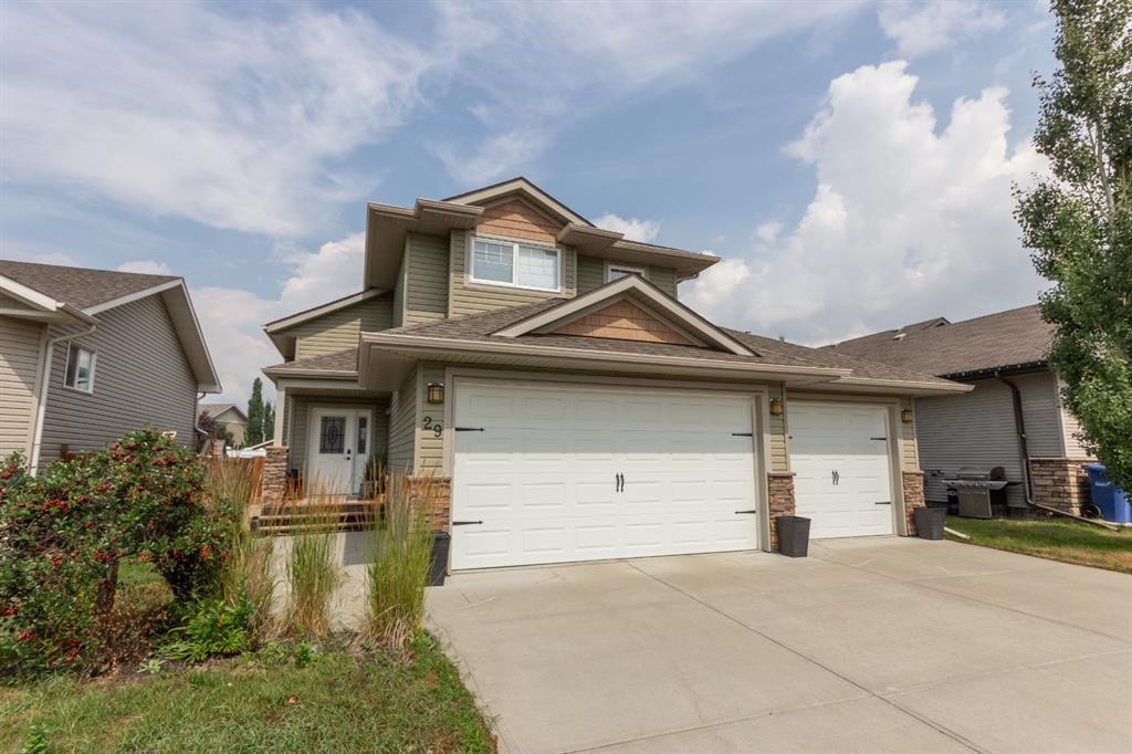 Situated on a quiet crescent and conveniently located just steps from all of Penhold's amenities, this Asset built modified bi-level offers a large triple garage and open floor plan with vaulted ceilings. Upgrades include hardwood and tile flooring throughout, hickory cabinets, and a large living room with a cozy gas fireplace. One bedroom on the main floor sits adjacent to a full 4 pce bathroom, and the primary suite is located over the garage, with its own private 4 pce ensuite and a walk in closet. The basement is unfinished and open to your development ideas, and builder plans will be provided. Outside you'll find a huge fully fenced and landscaped back yard, with space to add RV or trailer parking if desired, and there's enclosed storage under the deck. The attached triple garage is finished and insulated. Furniture can be included with the sale, and immediate possession is available!
