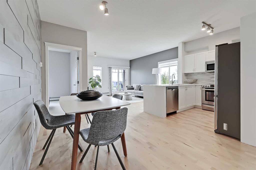 This TOP FLOOR CORNER UNIT 2-BED, 2-BATH + DEN offers 937 sqft and is the largest of this floorplan offered in the complex!- Your new home awaits in the highly walkable community of PANORAMA HILLS! This established community is rich with shopping, recreation, dining, and other amenities for those looking for convenience. Tasteful finishings and a great 2-BED + DEN layout w/ 9-FT CEILINGS (only available in the top floor units) make this spacious TOP FLOOR, CORNER UNIT condo in the popular and modern Panamount Place an incredibly desirable space. Complete with unobstructed SOUTH and EAST VIEWS from the WRAP-AROUND BALCONY (freshly painted), modern maple laminate, tile flooring, and plush carpeted bedrooms, this home is move-in ready. A spacious and private front den/flex space welcomes you into your home with a built-in closet and access to the in-suite laundry before you enter the open-concept kitchen, dining, and living space. The updated, contemporary kitchen features lots of cabinetry for storage, a modern backsplash, quartz countertops, an upgraded stainless steel appliance package, and direct access to the dedicated dining room with space for a 6-person dining table and a modern feature wall. The living room has a corner gas fireplace, window and a sliding glass patio door for lots of natural light across the entire main living space and a large balcony equipped with a gas BBQ line and space for outdoor furniture. The primary suite features a good-sized window, a custom walkthrough California closet, and a nice 4-pc ensuite with a large vanity with lots of storage, a tub/shower combo, and tile flooring. The secondary bedroom is perfect for a roommate or a kid’s room, with a built-in closet and access to the main 4-pc bath. No condo is complete without building features and amenities! This meticulously maintained complex enjoys maintained grounds and common areas, mature trees, and reasonable condo fees that are inclusive of all utilities, making budgeting a breeze. There’s in-suite laundry with a stacked washer/dryer, one TITLED PARKING STALL in the HEATED UNDERGROUND parkade, and a sizeable STORAGE LOCKER. Plus, the complex is PET-FRIENDLY! Panorama Hills is the perfect location to be close to…everything! This picturesque community is surrounded by green spaces, including the 36-hole Country Hills Golf Course, playgrounds, bike paths, and a fabulous community center complete with a water park! You’re also across the street from Notre Dame High School, Vivo for Healthier Generations, Landmark Cinemas, and the entire Country Hills shopping centre with everything from Staples to Starbucks to Sobeys and more. With direct access to Harvest Hills Blvd and Country Hills Blvd, the rest of the city is just moments away as well. Don’t miss your chance to own this contemporary home; it’s exactly what apartment-style living should be!