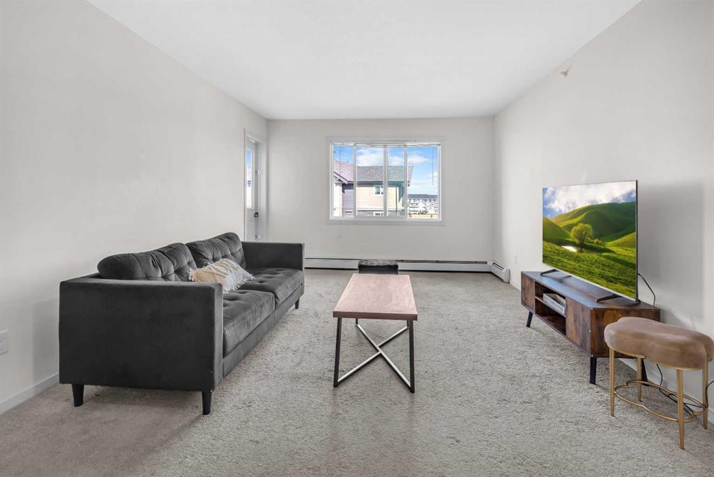 Welcome to the pinnacle of urban living at 181 Skyview Ranch Manor NE, Unit #4417—an exquisite TOP-floor residence that perfectly balances modern sophistication with cozy charm. This stunning 2-bedroom, 1-bathroom home, sprawled across 897 square feet (2 PARKING STALLS: 1 UNDERGROUND 1 SURFACE), offers an open-concept layout that is both airy and inviting, ideal for both relaxing and entertaining. Step inside and be welcomed by a bright, expansive living area where natural light dances across the space, highlighting the meticulous design and premium finishes. The heart of the home is the beautifully appointed kitchen, featuring luxurious quartz countertops that gleam under contemporary lighting. With ample cabinetry, high-end stainless steel appliances, and a sleek breakfast bar, this kitchen is both stylish and functional—perfect for whipping up gourmet meals or enjoying casual bites. Adjacent to the kitchen, the spacious living room opens up to a private balcony through sliding glass doors. This outdoor haven is your perfect escape for al fresco dining, relaxing with a book, or simply enjoying the fresh air. The balcony comfortably accommodates a 6-piece dining set, making it a fantastic space for hosting gatherings with friends and family. Both bedrooms are designed with comfort in mind. The master suite offers a tranquil retreat with generous space and serene ambiance, while the second bedroom is equally spacious and versatile, ideal for guests, a home office, or a cozy den. The bathroom is elegantly appointed with a modern 4-piece setup, including a stylish tub/shower combo and a single vanity with ample storage beneath. For your convenience, this home features in-suite laundry and additional in-suite storage, ensuring everything you need is right at your fingertips. Parking is a breeze with two dedicated stalls: a heated underground spot for comfort in winter and a surface-assigned space for everyday ease. Plus, visitors will appreciate the abundant parking options close to the entrance. Elevate your lifestyle with this top-floor gem in a sought-after community, where every detail has been thoughtfully crafted to provide a blend of luxury, comfort, and convenience. There is also a community kitchen/common area plus a gym inside the complex to enjoy. This is more than just a home—it's a lifestyle statement waiting for you to make it your own.