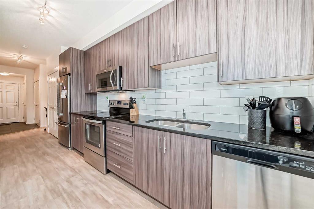 EXPERIENCE a LUXURIOUS yet AFFORDABLE LIFESTYLE in this DESIGNER-STYLE 3rd-floor Condo, built by renowned builder Brad Remington. Ideally located in the BEAUTIFUL COMMUNITY of LEGACY, this 1-bedroom, 1-bathroom condo comes with " 1 TITLED UNDERGROUND PARKING SPOT ", ASSIGNED STORAGE, and LOW CONDO FEES. It's PERFECTLY SITUATED Across from a POND, WALKING PATH, PLAYGROUND, Public Transportation, and within WALKING DISTANCE to SCHOOLS and RETAIL SHOPS. This fully loaded unit will Truly IMPRESS YOU from the moment you walk in. It features an OPEN-CONCEPT KITCHEN, 9-FT KNOCKDOWN CEILINGS, GRANITE COUNTERTOPS, STAINLESS STEEL KITCHEN APPLIANCES, a FRONT-LOAD Washer and Dryer, a Tiled Entrance, and laminate flooring throughout. The spacious living and dining rooms are combined into one LARGE SPACE, where you can RELAX and UNWIND after a long day. The large sliding door leads to the North-facing balcony, which offers an AWESOME VIEW and is PERFECT for BBQs this summer. The unit INCLUDES in-unit ~~~ AIR CONDITIONING ~~~ for the warm summer months is a BiG BONUS, a BUILT-IN CLOSET ORGANIZER in the master bedroom, and convenient access to the South Health Campus, 4 golf courses, McLeod Trail, Stoney Trail, Deerfoot Trail, South Calgary Hospital, and Fish Creek Park. This is the PERFECT PROPERTY YOU HAVE BEEN WAITING FOR, offering the lifestyle you deserve. CALL NOW and SCHEDULE your private SHOWING before it's gone !!!