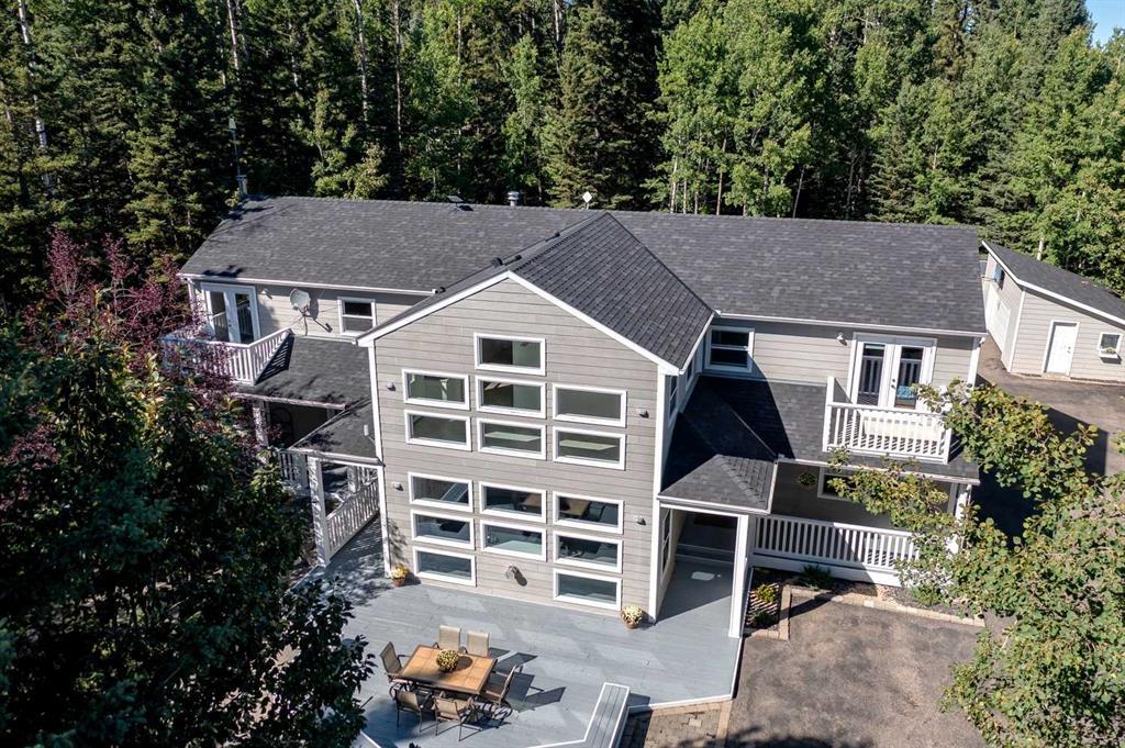 Welcome to this exceptional 3200+ sq. ft. custom family home, just a 4-minute drive from beautiful Bragg Creek. Featuring an additional 800 sq. ft. as a full size GYMNASIUM with a 20' ceiling, energy-efficient lighting, and a sport court floor, this residence is designed for both luxury and practicality. Enjoy the brightness and warmth of this sunny location, even in winter, on a beautifully treed and fully fenced 2-acre, corner lot that’s perfect for your pets. The main floor showcases 9' ceilings, in-floor heating, and stunning high quality laminate floors and new carpet throughout. Walls of windows flood the space with natural light. The spacious kitchen features granite counter tops, a large island with an eating bar, and a walk-in pantry. A formal dining room is perfect for entertaining, while the step-down living room with a gas fireplace offers a cozy retreat. The FAMILY/MEDIA ROOM is an entertainer’s dream with a stunning Rundle stone wood-burning fireplace, custom-built shelving, a bar, and a 90" motorized screen with an HD projector and surround sound. Wired sound system throughout the home, gymnasium and outside. Covered, outdoor HOT TUB. Upstairs, the king-sized master suite boasts a large walk-in closet and a luxurious 5-piece ensuite with an oversized soaker tub. Three additional bedrooms, a SUNROOM, laundry room, and walk-in linen closet complete the upper level. Outside, enjoy your own private 65-yard Par 3 golf hole and a 450 sq. ft. putting green. Ride you personal trail system by bike or quad, or take a short stroll to the nearby small lake for canoeing or skating, directly across the road from local hiking trails. The renowned Wintergreen Golf Course is just down the road. Recent updates include newer shingles and upgraded heating in the double attached garage. And for added space an additional detached, heated double garage/workshop and two driveways with RV parking add to the convenience. Enjoy high speed internet with Starlink. This sun-filled home is ready for a new family, offering a perfect blend of play and relaxation in the picturesque hamlet of Bragg Creek with 40 minute drive to Calgary. Experience stress-free lifestyle among the spruce and poplar, where every day feels like a retreat. Please Note: The Wintergreen Water System is now connected to Rocky View.