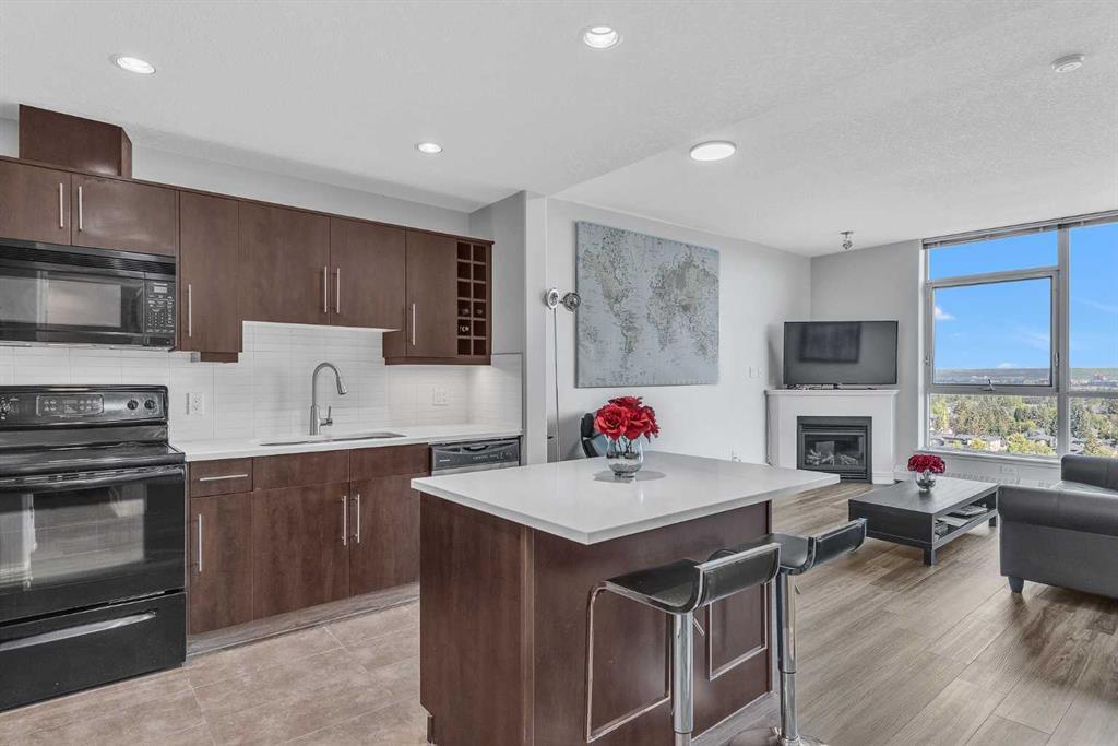 Fantastic 14th floor apartment with great views of Nose Hill Park, Shaganappi Golf Course, and downtown Calgary. Walk to Westbrook C-train station in a few minutes. Shopping, amenities, and restaurants are on your doorstep. And downtown is a short commute by bike, car or transit. A bright and spacious 1 BED & DEN unit with 9ft ceilings, features VINYL PLANK FLOORING in the living areas and bedroom, Quartz counters in the kitchen and bathroom, and new modern low profile light fixtures. The generous kitchen provides plenty of cabinet and counter space, under-cabinet lighting, and a kitchen island for casual dining. The open plan living room with gas fireplace (recently serviced) has space for a dining table if wanted or creates a large living room with wonderful views. A good-sized balcony is a great spot to relax and watch the world go by on a summer evening. And the den space at the entry would make a perfect work-from home office. This unit includes a titled UNDERGROUND PARKING STALL, STORAGE LOCKER in a secure room, and a designated bike room. The building offers amazing amenities including a swimming pool, hot-tub, fitness centre with quality equipment, a recreation room with table-tennis, pool table and lounging areas. Plus, there is an on-site manager and security. This unit would suit anyone looking for a maintenance free lifestyle with good building amenities, in a walkable neighbourhood. Come take a look and see why this is a smart move for you!
