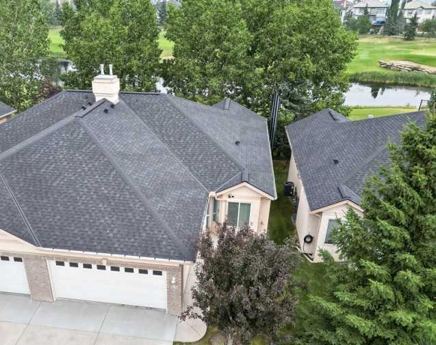 Pristine, modernized, fully developed walk out villa backing directly on golf course pond with beautiful views of green space! Walk into this immaculate home with exotic hardwood throughout the open concept main floor. Classic updated bright, white kitchen with French cottage-style bead board shaker cabinets with gleaming granite countertops and mosaic backsplash with under counter lighting. Newer appliances including ceramic top stove. One level island with pendant lighting and built in cabinets. Dining room with sunken coffered dark accented ceiling. Living room has view of golf course pond and yard with large, mature trees. Vaulted ceiling and focal fireplace with matching mosaic tile work with white pillars and mantle. Private, large deck overlooks golf course with vast view of the pond. Main floor primary suite has mirrored walk in closet and luxurious updated ensuite with large tile flooring, soaker tub with modern tile surround, cultured marble countertop and independent walk in shower. Second main floor bedroom off the entrance with opaque interior window and large exterior windows. Fully finished walk out basement with access to patio and back yard. Corner gas stove and ceiling fan with lighted Italian-style art niche. Family room has roughed in plumbing ready for wet bar or basement kitchenette. Newer furnace with central air conditioning, power drip humidifier, built in vacuum and hobby shop in the utility room. Moments from shopping with easy access to all amenities. A stunning location within Emerald Park!