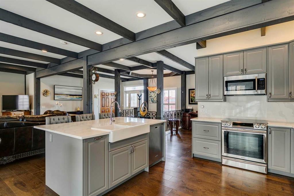 Step into luxury with this rare opportunity to own a meticulously updated former AVI Dream Home, a bungalow that epitomizes elegance and sophistication. This one-of-a-kind property boasts over 1,700 sq ft of main level living and a total of more than 3,400 sq ft of developed space, ensuring ample room for both relaxation and entertaining. Begin your day with serenity on the charming old farm-style front porch, which stretches across the entire width of the home. Inside, quality abounds with solid core doors throughout, an open concept great room featuring an impressive stone fireplace (converted to gas in 2020), stunning wide plank hardwood floors, and architecturally designed wooden beams. The detailed and painted ceilings, LED pot lights, and designer light fixtures enhance the home's warmth and modern elegance. The chef’s kitchen, fully renovated in late 2020, is a culinary dream. It showcases a farmhouse ceramic sink, quartz countertops, and a stylish backsplash. The central island and ample cabinetry offer both functionality and sophistication. Adjacent to the kitchen, you'll find a convenient office nook and a dining area, perfect for entertaining. Enjoy alfresco dining on the Duradek patio, complete with a gas line for your grill. The luxurious primary retreat is a sanctuary of comfort and style, featuring a spacious walk-in closet with wood built-ins, and an ensuite designed for relaxation. Pamper yourself in the large stand-alone soaker tub or the expansive walk-in shower, and enjoy the dual sink vanity and separately enclosed toilet. The fully developed, walk out lower level adds another 1,729 sq ft of living space. It includes a bright and spacious living room, two generous bedrooms, a large flex room, two full bathrooms, a substantial laundry room, and a separate shelved storage room. Recent upgrades include a high-efficiency furnace, central A/C, hot water tank, and water softener (installed in 2019/2020). Step outside to discover a private west-facing backyard oasis. The space features an exposed aggregate patio and a hot tub pad, all surrounded by meticulously landscaped gardens, mature trees, raised perennial beds, and serviced with an underground sprinkler system. Completing this stunning bungalow is a double attached garage with shelving, offering both convenience and additional storage. Impeccably maintained and updated, this home is ready for you to move in and start making memories. Opportunities like this are rare—don’t miss your chance to own a truly exceptional property.