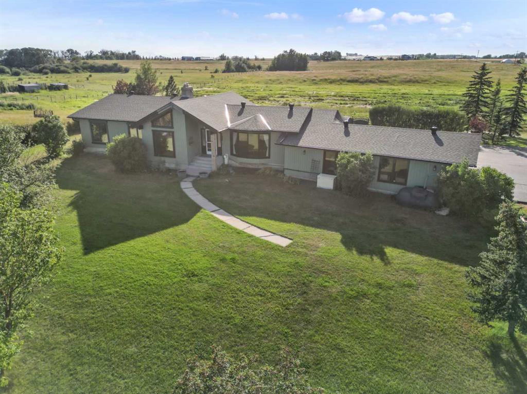 Welcome to your forever home nestled on a pristine 11.50-acre property with over 3,820 sq. ft. of well maintained living space. This stunning bungalow, featuring 6 bedrooms and 4 bathrooms, offers the perfect blend of rustic charm and modern convenience, all surrounded by breathtaking views of endless blue skies and picturesque landscapes. Step inside to be greeted by a warm and inviting atmosphere, highlighted by a vaulted cedar ceiling with exposed beams that stretch across the expansive living area. East and west floor-to-ceiling windows capture every sunrise and sunset, bathing the home in natural light. The cozy sitting room features a gas fireplace, creating a perfect space for relaxation. The heart of this home is the spacious kitchen, complete with granite countertops, stainless steel appliances, and a charming bay window above the sink. Slate tile flooring and ample storage make this kitchen as functional as it is beautiful. Just off the kitchen, an informal dining area provides a great space for casual meals, while the formal dining room, with its large bow window and built-in pantry, is perfect for entertaining guests. The main floor boasts a luxurious primary bedroom with direct access to the west-facing deck. The five-piece ensuite bathroom features a classic clawfoot tub. Two additional bright and spacious bedrooms, along with a four-piece bathroom featuring another clawfoot tub, are also located on the main floor. Additional features include a three-piece bathroom by the mudroom, a welcoming foyer, and hardwood floors throughout. The fully finished basement is designed for comfort and versatility, featuring an extremely large family room with a fireplace, perfect for movie nights, games or gatherings. The basement also includes a two-piece bathroom in the laundry room, a generously sized extra-large bedroom, a second sizeable bedroom, and a third bedroom currently used as a homeschool room. Outside, you'll find everything you need to embrace the rural lifestyle. The property includes a 50.6’ x 30.6’ livestock barn, auto waterer, and new paint. Three additional storage sheds, along with a poultry coop. The exterior of the house and trim has recently been painted, and the property features a new asphalt driveway, a beautiful water fountain, and fully fenced grounds. Enjoy outdoor living with a large west-facing deck and patio area perfect for barbecues. A triple car heated garage provides ample space for vehicles and equipment, and the property is equipped with a backup generator, triple pane windows, and an RV dump station with electrical hookup. With easy access to Highway 2 and just minutes from City Limits and Okotoks, this property offers the best of both worlds—peaceful rural living with convenient access to urban amenities. This is more than just a home; it's a lifestyle.