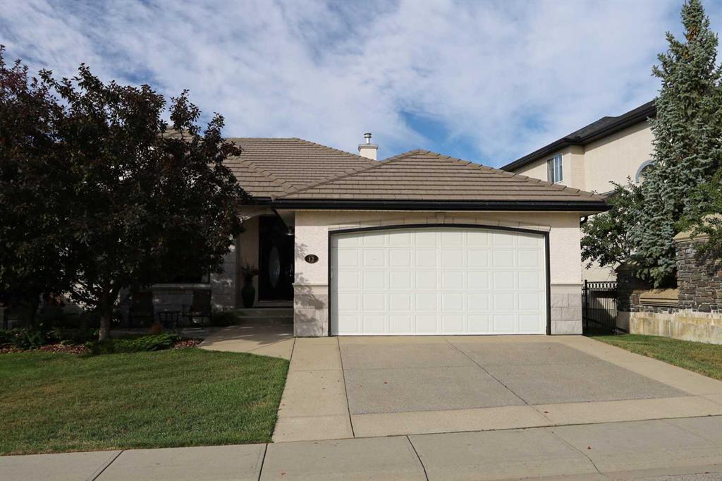 Rare opportunity to make your home in this exclusive enclave of upscale homes custom-built by Lupi Luxury Homes in Northwest Calgary's only lake community. Perched on the ridge surrounded by panoramic views of the mountains & Canada Olympic Park, this truly amazing villa is a sight-to-behold...& offers 3 lovely bedrooms & 3 full baths, rich hardwood floors & central air, stylish gourmet kitchen with granite countertops & finished walkout level with infloor heating. Complemented by 10ft ceilings & an expanse of windows, the main floor of this amazing home enjoys a free-flowing open concept design highlighted by the gracious living room with toasty gas fireplace, elegant formal dining room with columns & dining nook with access onto the recently refinished (with Duradek in 2023) balcony. The gorgeous kitchen has a walk-in pantry, centre island with raised bar & upgraded black appliances including the cooktop stove & built-in oven. The owners' retreat is your relaxing private sanctuary & comes complete with large walk-in closet & jetted tub ensuite with tile floors, double vanities & separate shower. The walkout level - with 9ft ceilings & infloor heating, is beautifully finished with a big open games/rec room, 2 bedrooms & full bathroom, media room with French doors & exercise room. Main floor also has dedicated home office with French doors, another full bath with shower & laundry room with built-in cabinets, sink & LG steam washer/dryer. Additional extras & features: custom window coverings, underground sprinklers, remote-controlled retractable awning & gas BBQ line on the balcony, concrete tile roof, new hot water tank in 2018, storage shed for your gardening tools in the backyard & no monthly maintenance fees. Premier location within walking distance to bus stops & just minutes to neighbourhood schools & the lake (with its year-round activities including boating & fishing, ice skating, beach, tennis courts & more), easy access to Crowfoot Centre & LRT, University of Calgary & Foothills Medical Centre, plus quick commute to downtown.