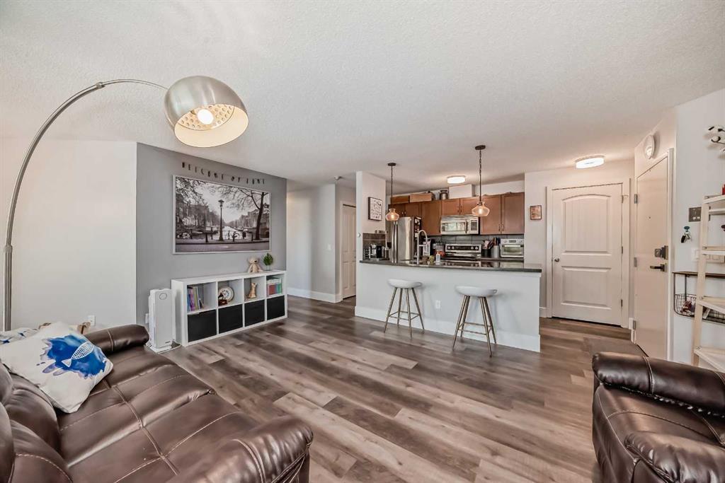 Discover the serene beauty of this hillside retreat with its private deck nestled among towering green trees and overlooking a picturesque waterfall and pond. Step onto the terrace to hear the melody of morning birds and see the cascading blue waterfalls, creating an inviting natural oasis. Inside, the spacious living area features a modern color scheme, a cozy wood-burning fireplace, and Newly renovated Luxury Vinyl Flooring throughout the unit with no carpet(2022) that fill the space with gentle sunlight. The kitchen boasts solid maple cabinetry, granite counters, a stylish tile backsplash, stainless steel appliances, and a raised breakfast bar, seamlessly flowing into a charming dining area bathed in sunlight. The master bedroom offers a tranquil retreat with ample natural light, a private shower, and a generous closet. A second large bedroom and another full bath ensure comfort and convenience for residents. Additional features include full-sized in-suite laundry, heated parking, and a storage locker. Condo fees cover all utilities except electricity. Residents enjoy convenient access to amenities including a private gym, indoor pool, tennis courts, and a spacious social room within the building. Located just moments from downtown, shopping, cafes, steps away from the bus stop, and a short drive to the Canadian Rockies, this location offers unparalleled convenience and tranquility. Don't miss this unique opportunity to make The News your new home!