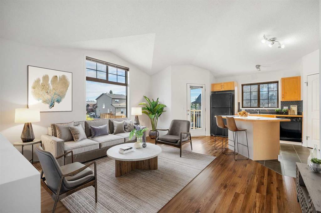 Discover this exceptional upper unit that radiates natural light and features dramatic vaulted ceilings! The inviting open floor plan boasts a spacious living room that seamlessly flows into the kitchen, now enhanced with brand new floor tile. The kitchen showcases a stylish tile backsplash, a central island, black appliances, and a convenient corner pantry. Step out onto the sunny balcony for a breath of fresh air and enjoy the vibrant atmosphere of your new home. This unit offers a modern, airy feel with gleaming new floors throughout the living room and kitchen. Down the hall, you’ll find a full bathroom with in-suite laundry, a master bedroom, and a versatile second room that can serve as a den or an additional bedroom. Located just minutes from local amenities, public transit, schools, parks, and the renowned Spruce Meadows, this condo combines convenience with comfort. With very reasonable condo fees, a tankless hot water system, and a top-floor location, this property is a must-see! ** Some of the photos have been virtually staged **