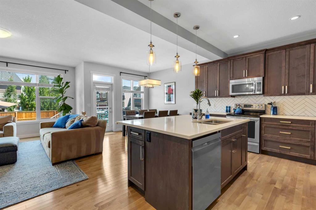 Welcome to this stunning 2-story home, perfectly situated on a spacious corner lot in the highly sought-after community of Nolan Hill. Conveniently close to schools, transportation, and a full range of amenities, this home effortlessly combines luxury and practicality with a thoughtfully designed floor plan. Upon entering, you'll be captivated by the gourmet kitchen, a chef's dream featuring quartz countertops, a large center island, raised maple cabinetry, a built-in pantry, and stainless steel appliances. The main level is highlighted by 9-foot ceilings, expansive windows, and rich hardwood floors. The bright living room, anchored by a central gas fireplace, flows seamlessly into a spacious dining area with patio doors that open to a vinyl deck complete with a gas BBQ hookup. Step outside to enjoy a cement patio and a sprawling, private backyard oasis. The upper level features a versatile bonus room and a luxurious master retreat, complete with vaulted ceilings, a walk-in closet, and a spa-like ensuite bathroom with double sinks, a soaker tub, and a double glass walk-in shower. Two additional bedrooms, a full bathroom, and a laundry room with brand-new high-end carpeting complete the upper floor. Additional highlights of this Trico-built home include an oversized front-attached garage, central air conditioning, 9-foot ceilings in the basement, and numerous other upgrades. This exceptional property is an absolute must-see!