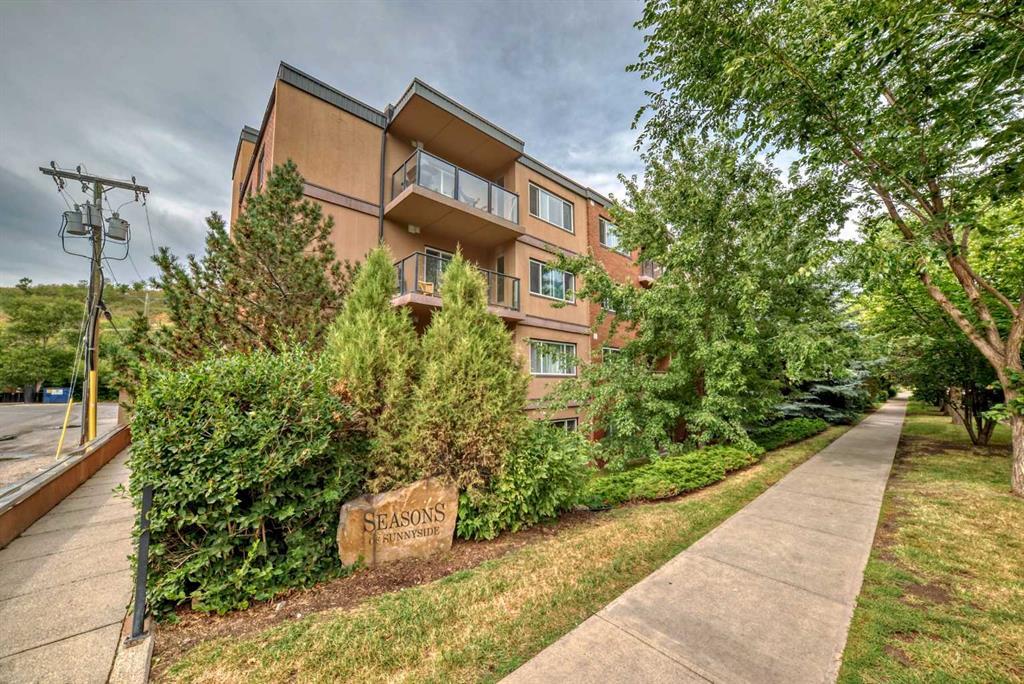 Discover this beautiful, updated condo boasting a sunny south-facing balcony that offers the best exposure in the building and overlooks a mature, tree-lined street. Step inside to find elegant wide plank engineered hardwood floors that flow throughout the space. The upgraded kitchen is a chef’s delight, featuring crisp white cabinets, stainless steel appliances, granite countertops, and a central kitchen island perfect for meal prep or casual dining. Just off the kitchen, the inviting living room is centered around a cozy fireplace with a built-in surround, creating a warm and welcoming atmosphere. The modern 4-piece bathroom is tastefully updated with granite counters, while the spacious primary bedroom provides a comfortable retreat. Additional conveniences include a full-sized washer and dryer within the unit and a convenient off-street parking stall located near the front entrance. Located in the desirable Sunnyside neighborhood, you’re within walking distance to all the shops and amenities Kensington has to offer, just a few blocks from the scenic river pathway system, and only a short walk into downtown Calgary. This exceptional condo combines style, comfort, and an unbeatable location, making it the perfect place to call home.