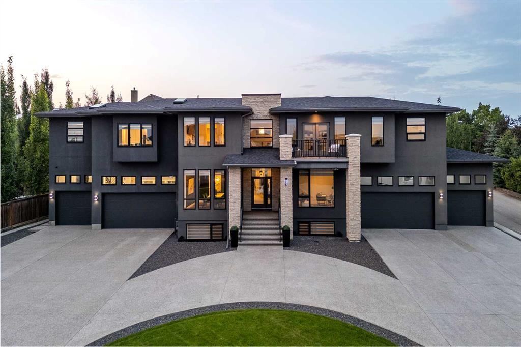 A striking architectural design coupled with a fabulous cul-de-sac location makes for a fabulous modern family five-bedroom home in Springbank Hill. The size of this spectacular yard is massive, 133 feet wide by 102 feet deep (.35 Acres) allowing for two triple garages on each side of the home, one for every day use and the West garage as the “showcase” dream garage. The backyard has an expansive lawn area, is fully fenced and is perfect for family and friends entertaining. Watch the kids play or throw the ball to your dog in your own backyard paradise. With over 6800 developed luxury square feet, this special family home boasts two triple-car garages, one toy garage with a “man cave” space above the garage and one everyday family garage, a sunroom flex space opening onto the backyard “outdoor living room” with a SwimSpa and hot tub, and incredible entertaining spaces. As you ascend the solid concrete stairs to the front entry, you are immediately taken aback by the contemporary and cutting-edge interior design, high ceiling heights, plank hardwood flooring and beautiful lighting. The designer kitchen is absolutely stunning with white lacquered cabinetry, tiger-wood styled accent cabinetry, quartz countertops and an artistic glass-tiled backsplash in a hexagonal pattern. A fabulous butler’s pantry leads to the formal dining area and a main floor den is separate from the rest of the home for private home office work. The gallery living room area is open to the kitchen and informal dining space and has an 11’ ceiling height, windows surrounding the TV and cozy central fireplace, stone accents and massive wall space for special art pieces. The upper level has an open loft family room, a gigantic laundry room and two children’s bedrooms, each with their own ensuite. Step into your “six diamond hotel” primary suite that features its own sitting area and fireplace for relaxation before retiring to bed. The adjoining ensuite has a unique design with a freestanding bathtub, frameless glass shower, tiger-wood style double vanity and a beautiful dressing room. Thoughtful window placement throughout the home and garage allows for streams of natural light throughout the day. The “open-to-above” staircase to the lower-level features an excellent art wall leading to the lower-level recreation area. The contemporary lower-level bar area has an island with a raised counter, and features another family/recreation room, area for a games table, two more bedrooms and a full bathroom. The “toy” garage is outstanding showcasing every feature imaginable. High windows above the garage doors bring in natural light and the high ceilings allow for car lifts. This is an incredible home in a fabulous location with access to walking paths, easy access to schools, and is within 20 minutes to downtown.