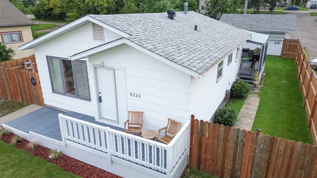 Welcome to 5223 54th Street, your mew home. Nestled just a short walk from schools, centrally located near downtown and shopping areas, this delightful 872-square-foot bungalow boasts two generously-sized bedrooms and a modernized 4-piece bathroom. The living space has been opened and seamlessly transitioning into a kitchen equipped with new, high-end stainless steel appliances, soft-close cabinetry, and a butcher block island. At the rear, a spacious laundry room leads to the backyard or down to the basement which also hold the second bathroom. The private, landscaped yard includes a covered patio and an expansive drive-through pad suitable for RV parking. Additionally, there is a sizeable double car garage, perfect for storage or as a workshop, complete with extensive heating and power capabilities. Ideal for those starting out or scaling down for retirement, this property is a must-see.