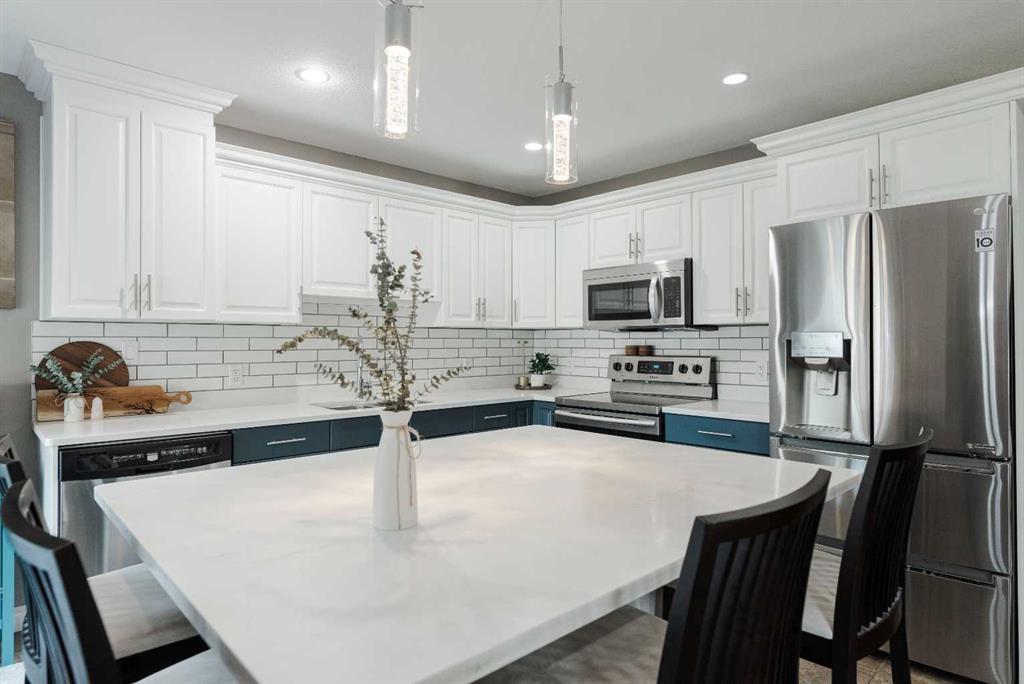 OVER 1800 sq feet of total living space, this exquisitely modernized 3 bed, 4 bath townhome will have you eager to pack your bags! A deep oversized aggregate parking pad welcomes you to the homes' double attached garage and front entry- parking is NO problem for this unit! The property has undergone numerous recent UPDATES including QUARTZ counters, white subway tile, black undermounted sink & faucet, updated and extended white- 2 tone CABINTRY, stainless steel appliances, Ceiling & pot light reconfiguration, updated light fixtures, MODERN WHITE TILED Primary ENSUITE/SHOWER with HEATED floors, NEWLY DEVELOPED BASEMENT with Luxury vinyl plank currently utilized as a living/games room but could also be used as a studio bedroom w/ ensuite, CENTRAL AC, CENTRAL VAC, Hot water tank (2019), and Garage Heater. Pride of ownership shines with this immaculate property- Book your showing today!!!