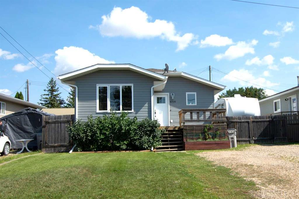 This well maintained, 4 bedroom property would be an amazing place to call home. Just a block away from the golf course and a quick walk to the spray park and playground, this property is in a great location. Alternatively, if you work at the hospital, it is a short walk to your job. Inside, there is a coat closet right next to the front door. The living room, dining area, and kitchen are open to one another with wood look flooring that unifies this space. The living room has a fresh appearance and a front window facing west. The kitchen has plenty of white cabinets making this space bright. There are 3 bedrooms off the central hall, with the main bedroom having a patio door to the back deck. The 4 pc bathroom is spotless and has cabinets and countertops to match the kitchen. Downstairs, the trim and doors are done in oak. There is a large family room perfect for kids toys, home gym, crafting area, etc. Next to it is an entertainment area with plenty of room for sofas and there is ceiling accent lighting. The bar has a countertop so you can line up your bar stools. There is a bedroom and 3 pc bathroom with pedestal sink. The utility room doubles as a laundry room and has extra space for a fridge and freezer. Outside, the back deck has plenty of space for the barbeque and deck furniture. The lawn area is tidy and is fully fenced, which is fantastic if you have kids or pets. There are planter boxes, a garden shed and a large gate so you can park your RV beside the house. There is plenty of off-street parking in front of the house. This would be a fantastic property for a family or anyone looking to downsize.