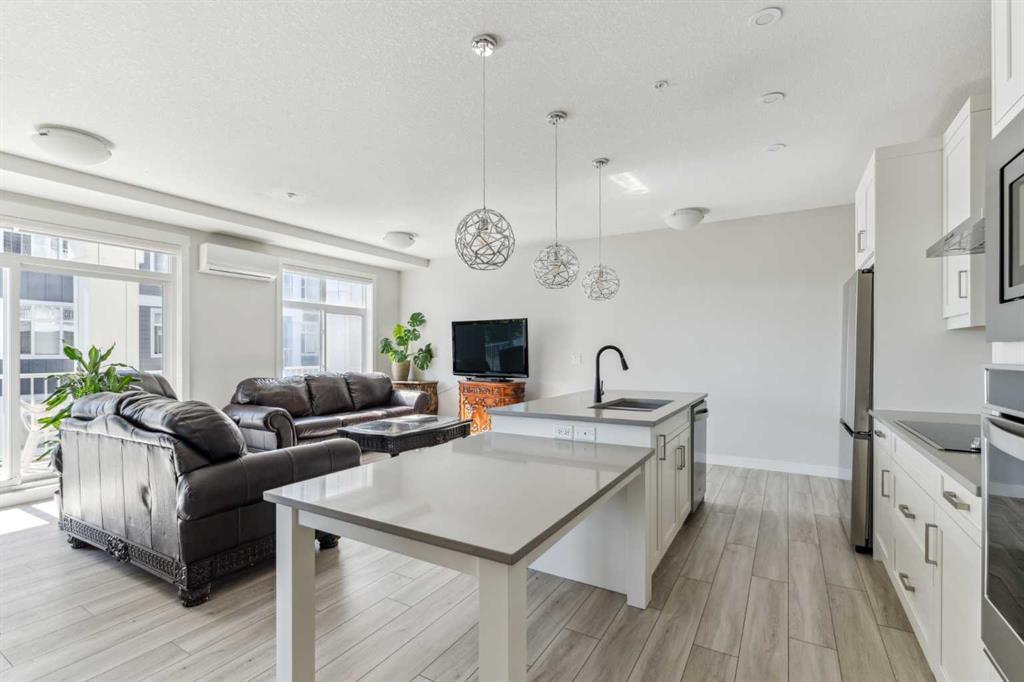 This gorgeous modern corner unit is one of the largest in the building with a south facing balcony and air conditioning, all in the beautiful lake community of Auburn Bay. Enjoy a basically brand new condo with luxury finishes, vinyl plank flooring, and 9 foot ceilings. The kitchen features bright white cabinetry, sleek quartz countertops, tiled to the ceiling backsplash, a two tiered island, and stylish pendant lighting. You’ll also love the stainless steel appliances, including a cooktop range, and built-in oven and microwave. The spacious living and dining areas have tons of natural light and access to the great sized balcony with a gas barbecue line. The comfortable master bedroom features a large walk-in closet, leading to the ensuite bathroom with double sinks, tiled to the ceiling backsplash, and linen closet. The secondary bedroom would make a lovely guest room or home office, and another full bathroom. You’ll find plenty of storage in the multiple closets throughout, as well as convenient stacked laundry. This is a fantastic opportunity to get into this desirable pet friendly community and experience low maintenance living, while not missing out on high-end touches. The complex is located in a prime area close to schools, shopping, restaurants, and amenities, with easy access to Stoney Trail.