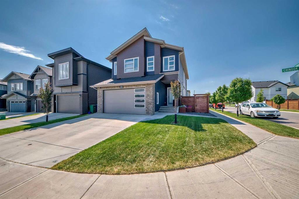 Welcome Home to 572 Chinook Gate SQ SW,Airdrie, AB Upgraded Home on a South facing corner lot in the community of Chinook Gate! Lots ofParking and Located across from a park! 2 Storey home w/Fully developed basement has 5 Bedrooms, 4 bathrooms. There is Central A/C, a Front Office w/ French Doors and built in bookshelves. Open Modern layout on the main level, comes w/9’ ceilings (main floor and basement) many pot lights and lots of large windows (Blinds that go up and down, is Powered for the stairwell window)letting in all the natural sunlight, durable laminate flooring. The Kitchen has Tall white cabinets w/under lighting, subway tiled backsplash, Stainless Steel High-end appliances (GE Café plus Bosch Super Silent Dishwasher 38db) window over the 6 burner gas stove, Quartz countertops, soft-close drawers, breakfast counter Island, walk-thru pantry. Hidden garbage/recycle bin, Spice drawer. Large Dining Room has door that leads to the sunny south backyard. Living Room comes w/ gas Tile surround fireplace. A 2 pc bathroom and a mudroom w/huge closet complete the main level. Iron spindled staircase lead to the upstairs, Bonus Room. Double doors enter into the Primary Suite features a 5pc Ensuite w/ tile floors(Heated bathroom floors (in all 3 full bathrooms) a soaker tub, walk-in shower, and a walk-in closet. 2 other large bedrooms, a 4pc Bathroom comes w/ Quartz counters, and Laundry Room complete the upstairs level. Down in the basement there is a gym (Gym equipment NEG)(could be easily transitioned back into a family room) 2 Bedrooms, 4pc Bathroom, and a Den. Outside-in the backyard there is 4.5x4landing with a BBQ gas hookup and a 15x25 irregular stamped cement Patio, Power hookup. Fully landscaped and fully-fenced. Double Attached Garage out front is heated and has a Utility sink w/hot/cold tap in garage Garage wall-mounted storage racks. Very Easy access to 24St and Yankee Valley Blvd, Walking distance to Chinook Winds Park and Walking paths, schools, parks, and the many amenities. This home is a must see! Schedule your private viewing CALL TODAY!