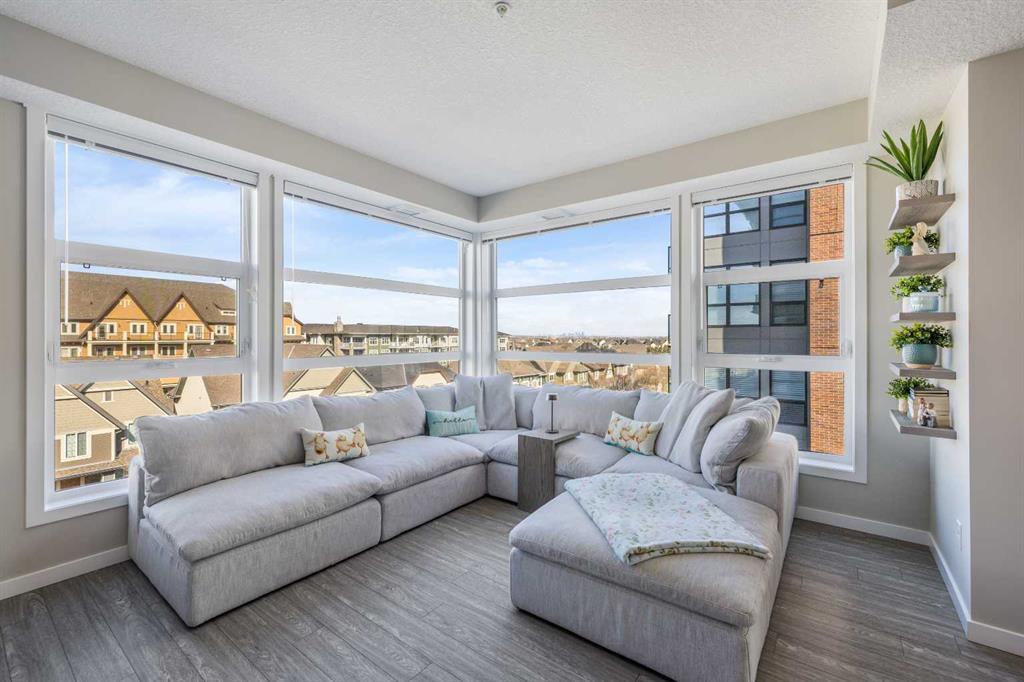 WESTMAN VILLAGE - Resort Living on Mahogany Lake. REMODELED BY CALIFORNIA CLOSETS / CITY VIEWS / CORNER MODEL / PROFESSIONALLY DECORATED / 2 TITLED PARKING STALLS / Great location in Calligraphy 1 building end unit with sunny North West views. RARE: Dual Supersized covered Balconies-Over 230SF-4th floor/2 bedroom/Den or Office/2 bathroom home. Builder square footage - 1121 SQFT. The current home owner took an already stunning home with Jayman BUILT's acclaimed Fit & Finish and elevated it to OUTSTANDING! Investing well over $100k+ he brought an interior designer in to create a space created for the most discerning of buyers. Every corner of this home has been touched with the sophistication of a high end hotel experience. Commencing with a front entrance keyless entry inviting you in to discover brand new upgraded Luxury Vinyl Plank flooring throughout complimented with beautiful neutral wallpaper and refreshed Benjamin Moore Paint throughout. The California Closet golden touches begin immediately as you notice the upgraded front entrance closet as you enter. The effortless laundry space just past the foyer boasts a new LG Tower washer and dryer along with a built-in cabinet with clothing hamper located close by. Stepping into the amazing kitchen area, you will feel like you have stepped into a designer magazine with the Subzero built-in fridge with panel front seamlessly matching the upgraded cabinets. Enjoy the new WOLF range and WOLF microwave as well as the Cove Dishwasher, also featuring a paneled front. The living room has always been a major star within this floor plan with soaring ceilings and an abundance of windows framing in the view of downtown Calgary. Always a pleasure to sit back and relax inviting the outside in while feeling you are inner city while in an urban environment. The Den, just off of the Great Room has been given a lovely make over with a wall of built-ins giving your home office an executive feel and two private decks give you two choices of exposure depending on your mood. There are two spacious bedrooms that have had both closets remastered maximizing space with the Primary Suite featuring the space for a King comfortably with your very own private en suite. Jayman BUILT's Westman Village is truly a one of a kind community with an abundance of shops, restaurants and amenities to suit every life style. The 40,000+square foot amenity centre has everyone at "hello" and will have your returning on the daily. A quick work out, a relaxing steam, a few laps in the pool, a nutritious smoothy or a light snack from the market place. Or a friendly hello from the 24 hour privacy team who will know you by name, the concierge who will assist in making your life easier and a place you can safely pick up the many Amazon packages we all know we order. All this capped off with TWO UNDERGROUND TITLED PARKING STALLS that you can get to without even stepping a foot outside with the numerous elevators and underground walk way. Enjoy your elevated lifestyle