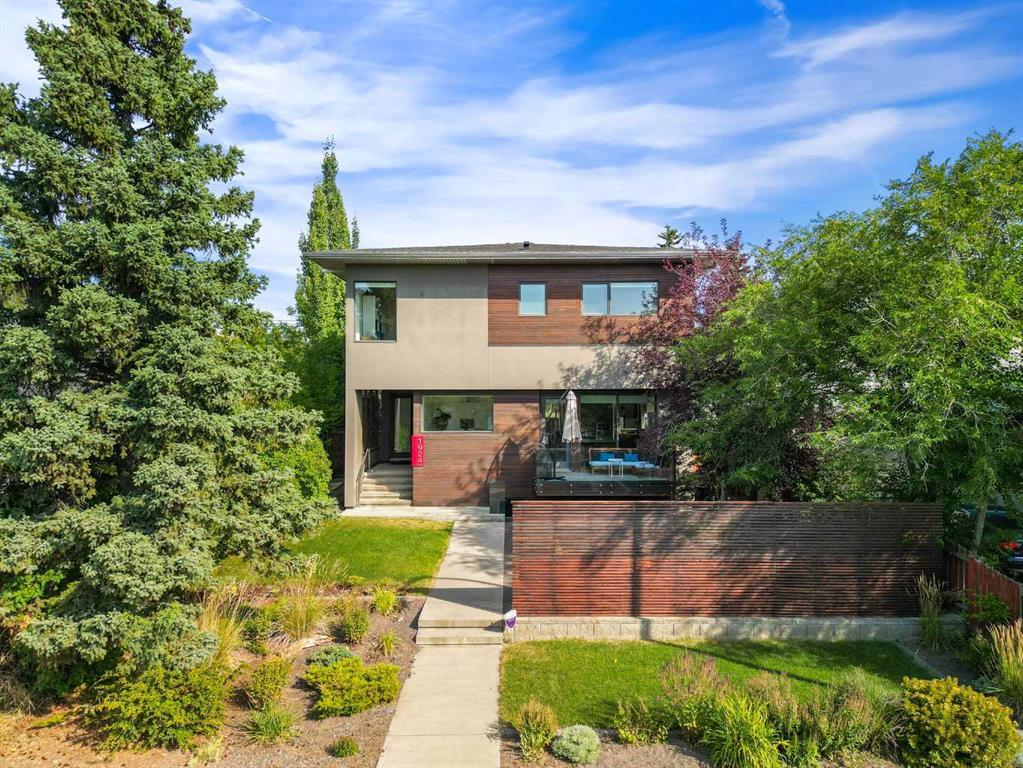 Wow! Homes like this do not come along very often. Designed and built by local Architectural firm Housebrand, the clean lines, attention to detail, and natural light in the home are unmatched. As you enter the home from the covered front porch, you are greeted by a spacious foyer with built-in drawers, a bench, and a closet. The hallway towards the living room features built-in shelves and a half bath with a custom concrete vanity. As you enter the living room, you will notice the stunning walnut hardwood floors, the retro-look Nelson saucer light, and the 11-foot-tall ceilings. The living room has a gas fireplace, additional integrated storage with a display shelf, and a built-in desk. The sliding doors open out onto one of the multiple decks in the backyard. The kitchen has a WOLF gas range, a large island with seating, and a unique window backsplash. There is a balcony off the kitchen to enjoy the southern sun all afternoon and overlook your fruitful garden boxes. The dining room has a huge window intended to bring in light but keep dinner parties private. The Bocci chandelier over the table was handmade in Vancouver. Heading upstairs you will notice more designer lights that highlight the tall ceilings. The primary bedroom takes advantage of backing onto a greenspace and you can see the City skyline peeking through the mature trees while you lay in bed. The primary bedroom has a walk-in closet and a 5 piece ensuite with in-floor heating and a separate water closet. Two more spacious bedrooms on this level share a 4 piece bathroom. Note that every bedroom upstairs has windows on two sides to maximize natural light. There is also a full laundry room on this level with a washing sink and a styler for easy refreshing and steaming of clothes. The basement of the home has 2 more large bedrooms, a 4 piece bath, and a large rec room with a wet bar. There is a den space in the basement for a home gym or play area. The wide lot of the home allows for many outdoor living spaces including a large pergola and multiple gas line connections for heaters, BBQs, fire pits, and more. The yard is so large that even with 3 different outdoor seating areas, there is still room for grass, a treehouse, a shed, and space for an RV, boat, or hot tub area. The garage is oversized (21'x24'), heated, and the back alley has been approved for paving by the City. Outside the backyard is the Bankview Dog Park with many benches to enjoy the Calgary skyline. Bankview is a unique neighbourhood with loads of character and a diverse selection of local businesses. It has quick access to downtown, all levels of school, Crowchild Trail, and Marda Loop. Book your showing for this special home before it sells!
