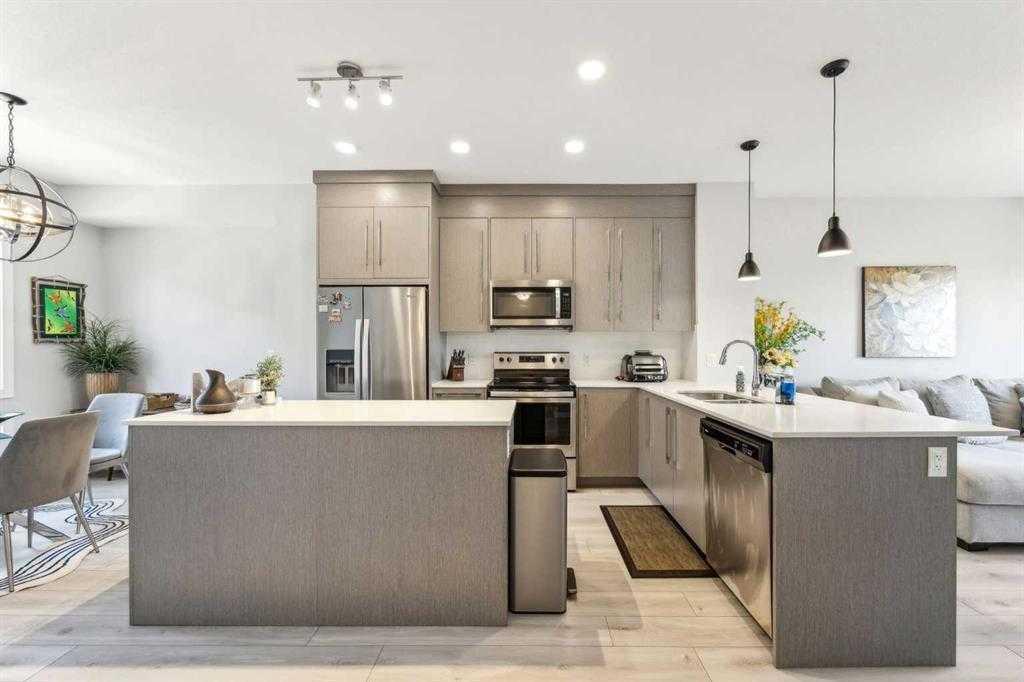 This exquisitely designed townhome boasts two elegant master suites and an additional den/bedroom on the main level, complemented by 2.5 modern bathrooms. Upon entering, you’ll be instantly captivated by the open-concept layout, where sleek laminate flooring flows effortlessly across all three levels. The main level features a contemporary kitchen, equipped with stainless-steel appliances, a chic island, and stunning quartz countertops, making it a chef's paradise. The adjacent living and dining areas create an inviting atmosphere, perfect for entertaining family and friends. Step out onto the west-facing balcony to enjoy peaceful moments while taking in breathtaking views of the beautifully landscaped courtyard and lush green space. Convenience is paramount with a double attached garage, providing ample storage for all your belongings and ensuring ease of access. Located in the vibrant community of Cornerstone, this townhome is just minutes away from schools, shopping centers, grocery stores, and a diverse selection of restaurants. Commuting is a breeze with easy access to the Saddletowne C-train and public transit options. Don’t miss the opportunity to make this stunning townhome your own! Schedule a viewing today and experience the perfect blend of modern living and community charm. The unit has been professionally cleaned, with the carpets of the stairs freshly washed and the walls receiving meticulous paint touch-ups, ensuring a pristine move-in ready home.