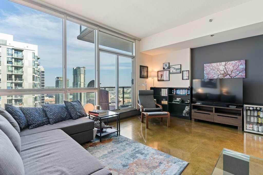COLOURS will be adding Colour to your life with Picturesque Views from the 19th floor of a 23-Floor High Rise which is strategically located in the BELTLINE and the sought-after Downtown! This is a bright, open and spacious, Air-Conditioned apartment with exceptional natural light, 9-foot ceilings and offering 2 bedrooms, a Full ENSUITE bathroom Plus a second full 3-piece bathroom! The very functional kitchen has plenty of cabinetry, stainless steel appliances and the adjoining huge living & dining rooms will lead you through sliding patio doors to an expansive EAST balcony with a gas line for a BBQ! You will be sure to enjoy the easy to care for polished concrete flooring, granite countertops, central air conditioning & in-suite LAUNDRY and yes there is TITLED underground parking. This is a well managed building with communal patio, recycling bins and bike storage. Come, enjoy an ideal urban lifestyle at an affordable price in a Pet-friendly building where dogs are welcomed with board approval.
