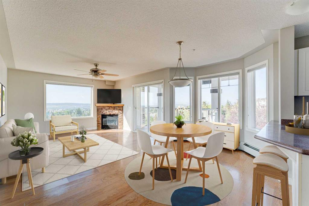 2 BEDROOMS | 2 BATHROOMS | 1,185 SQ FT | OPEN LAYOUT | TITLED UNDERGROUND PARKING | LARGE SW FACING BALCONY | AMENITY RICH BUILDING | Welcome to this original owner 2 bedroom, 2 bathroom condo located in the sought after Pavilions at Rocky Ridge. The home has been newly painted and features hardwood floors throughout. As you enter the home, are welcomed into a spacious foyer with large front entry closet inviting you into the space. The open living area features large windows filling the space with an abundance of natural light. Enjoy the spacious u-shaped kitchen with plenty of cabinet and counter space, a window over the sink, and a convenient breakfast bar. The dining area features a beautiful bay window and opens onto the spacious living room with brick facing gas fire place to enjoy with friends and family. The spacious deck off the living room with stunning views of the mountains is perfect for enjoying evening sunsets or bbqs. The deck also features an additional storage room. The master retreat is the perfect place for relaxation with a large walk-in closet and 3-piece bathroom with large fully tiled walk-in shower that provides accessibility for those who require it. This home also features an additional bedroom, 3-piece bathroom, and laundry room with additional storage. You will enjoy having your own titled parking spot with storage cage above in a secure heated underground parkade. This building also includes an abundance of amenities including a fitness centre, party room, hair salon, theatre, library and games room, visitor parking and onsite management. Don't miss out on this incredible opportunity to own this home today! Photos are virtually staged and are not an accurate depiction of current property.
