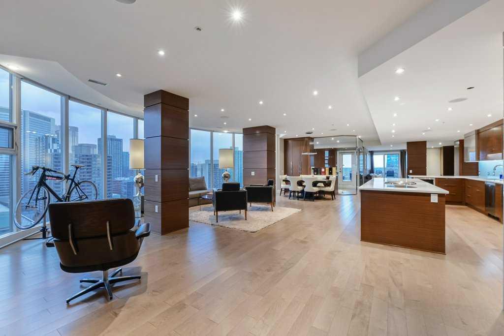 Experience the pinnacle of urban living in this completely renovated luxury penthouse condo, boasting unobstructed southwest and northeast views from two expansive wrap-around balconies. This exquisite residence includes two titled underground parking stalls, central air conditioning that ensures year-round comfort and offers a plethora of high-end finishes and customizations. This unit features three generously-sized bedrooms and a fully enclosed den with elegant 10-millimeter glass walls. The wide hallways enhance the open and inviting atmosphere, perfect for entertaining. The dining area is adorned with bespoke cabinetry and built-in wine storage, ideal for intimate dinners and gatherings. Culinary enthusiasts will appreciate the state-of-the-art kitchen, equipped with Miele and Thermador appliances, an induction cooktop, dual Faber hood fans, and a massive island with quartz countertops. The kitchen also features a clear glass backsplash and under-cabinet lighting for a sleek, modern look. Custom built-ins and a uniquely covered pillar create a focal point in the living area, complemented by an integrated sound system and remote-controlled blinds. Thousands of dollars have been invested in extensive millwork throughout the condo, including commercial-grade engineered Mirage hardwood flooring. The primary bathroom is a sanctuary with a glass tile shower, rain shower head, water closet, heated floors, and a gas fireplace for added comfort and luxury. Two additional well-sized bedrooms share a stylish 4-piece bathroom. This penthouse condo is a testament to refined taste and sophisticated living, offering unparalleled comfort, style, and functionality. It is truly a one-of-a-kind residence that promises an extraordinary lifestyle.