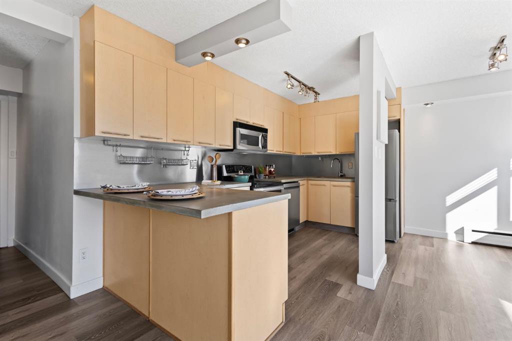 An incredible opportunity to own a charming, top floor, 1 bedroom condo with an unbeatable location, just steps to all the shops and services 17 ave has to offer. Welcome to Modella, a boutique building that has been beautifully maintained over the years offering the perfect blend of the liveliness of inner city living and the traquility of residential streets. This unit is move in ready and would be perfect for young professionals and investors! As you enter you are greeted by a spacious entrance that leads you to the open living space. The U-shaped kitchen offers concrete countertops, seating, great storage space and stainless steel appliances including a BRAND NEW refrigerator and newer dishwasher. The living area is spacious and bright with great views to the downtown and access to the sunny and private balcony. The perfect spot to enjoy the warm weather and grab some fresh air. Through the sliding frosted glass doors you'll find a great sized bedroom and in-unit laundry!! The 4-piece bathroom is updated with tile flooring and offers the same stylish concrete countertops found in the kitchen. This unit also comes with a COVERED parking stall and a SEPARATE storage room next door, not many units have this space and when it comes to condo living storage is king! The building also offers a shared laundry room, bike room and a newer elevator. This unit truly checks off all the boxes!!