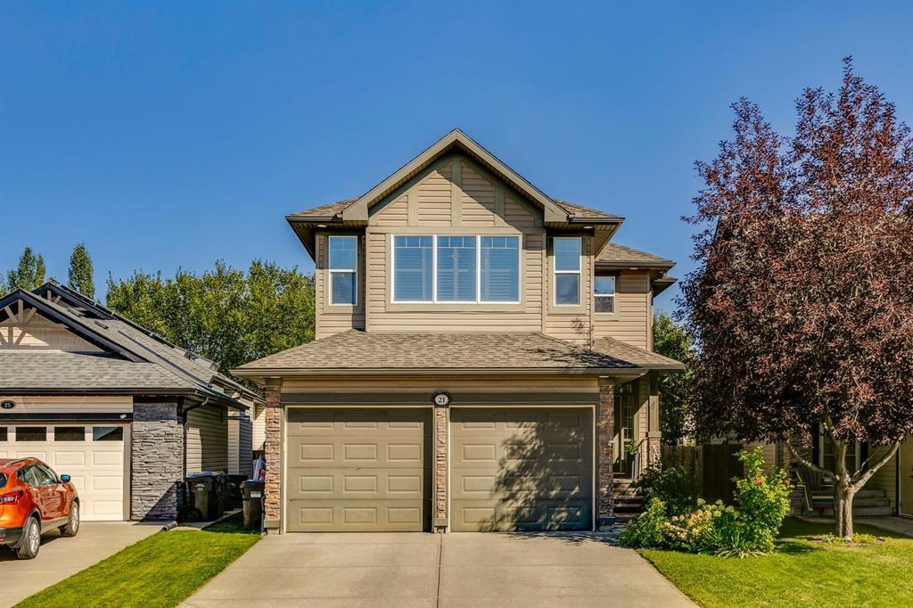 This pie-shaped lot is ideally situated on a spacious cul-de-sac, just steps away from a scenic pond pathway system that connects to nearby schools, amenities, the ridge, and Fish Creek Park. Step inside this inviting open-concept home, where high ceilings and an abundance of natural light create a warm atmosphere. As you enter the spacious foyer, illuminated by an abundance of natural light, you'll immediately feel a warm welcome from the beautifully upgraded interior. This stunning space features exquisite Brazilian pecan hardwood flooring, fresh paint, elegant in-stair lighting, and 9-foot ceilings. Custom Hunter Douglas blinds with wooden shutters adorn every window, adding a touch of sophistication. With central air conditioning, you can enjoy year-round comfort in this inviting home. The updated kitchen shines with quartz countertops, complemented by a modern subway tile backsplash, upgraded maple cabinets with crown molding, and under-cabinet lighting. The dining nook, enhanced by a detailed 10' ceiling, is surrounded by windows, creating a delightful place to enjoy meals. A versatile main floor den/dining room adds to the functionality of the space, while a mudroom provides additional built-in storage. The impressive upper floor plan includes three spacious bedrooms and two full bathrooms. The primary suite features a fabulous 5-piece ensuite with a soaking tub and walk-in closet. The sunken bonus room offers breathtaking west-facing mountain views, making it the perfect spot to bask in the sunlight. This level is conveniently completed by an upper laundry. The backyard is a true retreat, featuring an upper deck surrounded by trees and shrubs for added privacy. The professionally landscaped, low-maintenance lower yard is filled with perennials and provides ample space for entertaining friends and family. Its sunken design offers a serene oasis, shielding you from surrounding properties. You can easily personalize the space with a hot tub or play structures to create your ideal family retreat while saving time on lawn care. The basement is well-designed for future development, and the oversized garage adds to the home's convenience. The neighbors are friendly and welcoming. Recent upgrades include a new dishwasher, fridge, and dryer. Book your showing of this fabulous home today!