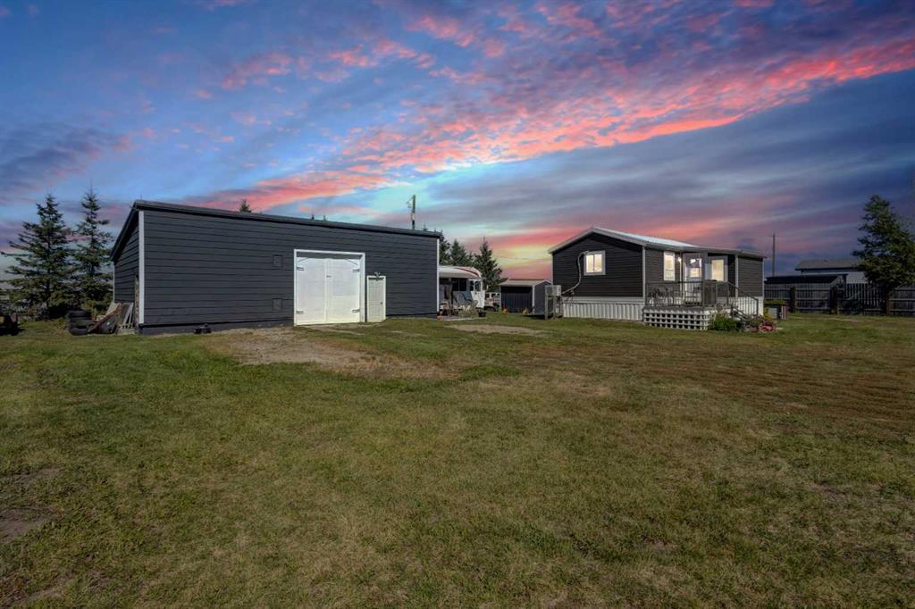 Welcome to the simple life! This fully RENOVATED house has the charm and privacy to help recharge the soul. The large yard, with 2 access points, 30 & 50amp hook-ups, a big shop with a 220V, poured concrete covered patio with a HOT TUB, mature trees, makes the space playful enough to enjoy hobby projects and still see the beautiful skies. Renovations include new siding and insulation, new metal roof on house and shop, new cabinets, luxury vinyl flooring throughout, RO water system, deck with aluminum railing, 4 raised garden beds, concrete patio with aluminum cover, and spray-foam insulated underneath the house. This residence has AC, stainless steel appliances, pot & pan drawers, and a private well in a quiet community close to main highway for accessibility. 40 mins to South Calgary.